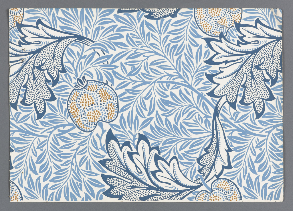 This is a Sidewall - sample. It was designed by William Morris and manufactured by Jeffrey & Company and made for Morris & Co.. It is dated 1887 and we acquired it in 1980. Its medium is block-printed paper. It is a part of the Wallcoverings department.