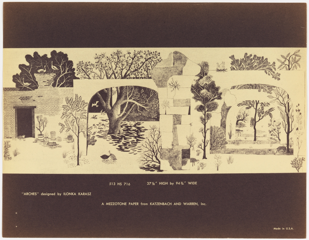 This is a Page from a sample book. It was designed by Ilonka Karasz and made by Katzenbach and Warren, Inc.. It is dated 1948 and we acquired it in 1959. Its medium is mezzotone print on paper. It is a part of the Wallcoverings department.