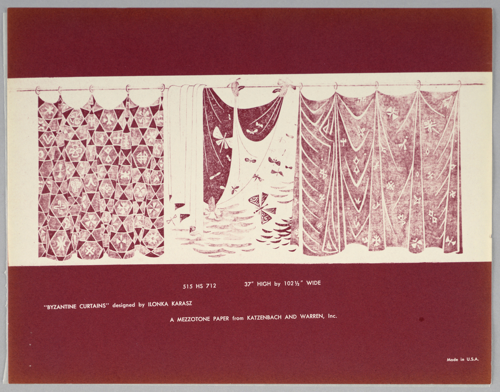 This is a Page from a sample book. It was designed by Ilonka Karasz and made by Katzenbach and Warren, Inc.. It is dated 1948 and we acquired it in 1959. Its medium is mezzotone print on paper. It is a part of the Wallcoverings department.