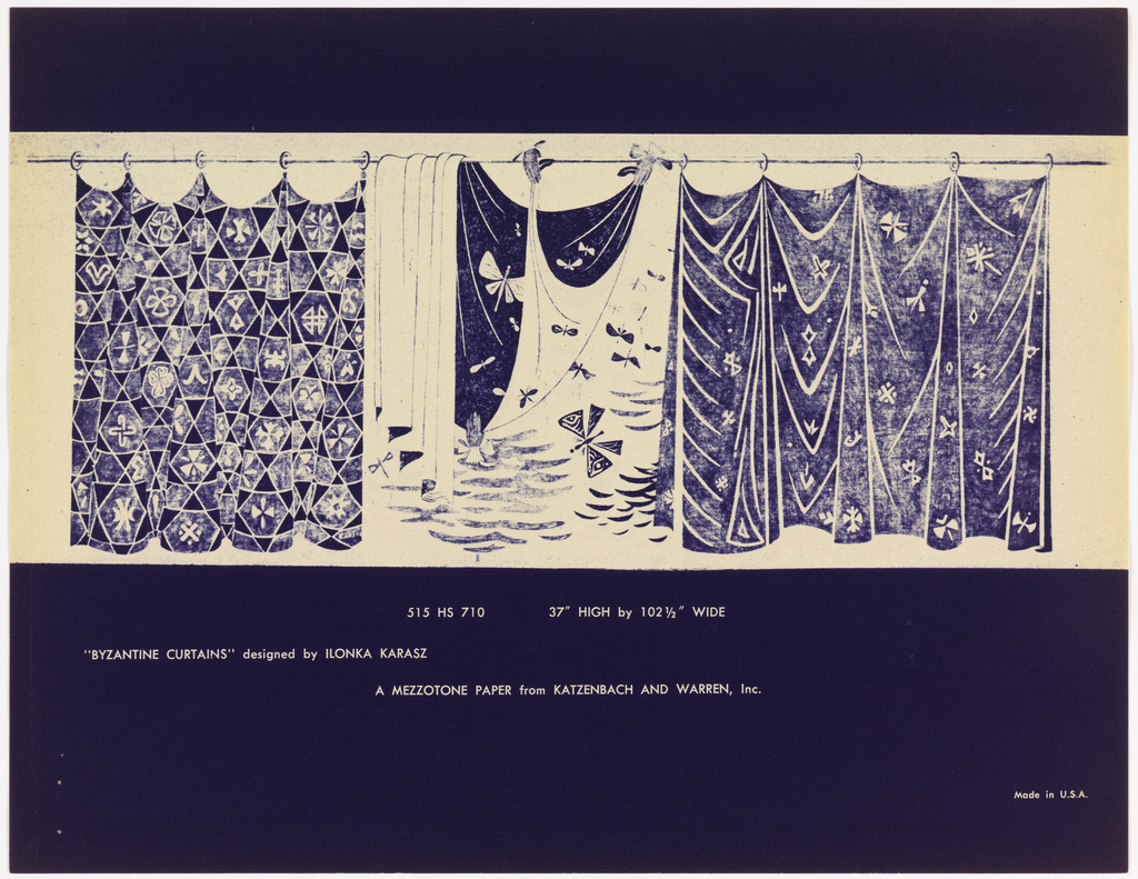 This is a Page from a sample book. It was designed by Ilonka Karasz and made by Katzenbach and Warren, Inc.. It is dated 1948 and we acquired it in 1959. Its medium is mezzotone print on paper. It is a part of the Wallcoverings department.