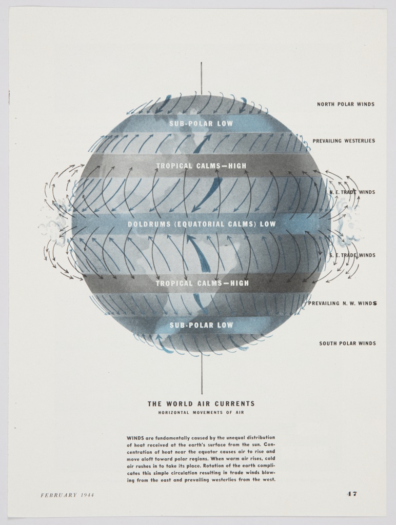 Print, The World Air Currents, Pages 47–48, Skyways; Designed by Herbert Bayer (American, b. Austria, active Germany and USA, 1900–1985); Published by Henry Publishing Company; Client: Skyways; offset lithograph on paper; 28.7 × 21.3 cm (11 5/16 × 8 3/8 in.); Museum purchase with funding provided by the Buddy Taub Foundation, Dennis A. Roach and Jill Roach Directors; 2016-54-367