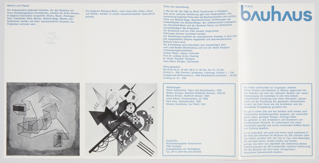 <ref name=CH>{{cite web |url=https://www-4.collection.cooperhewitt.org/objects/1108723107/ |title=Brochure, Bauhaus 50 Jahre |author=Cooper Hewitt, Smithsonian Design Museum |accessdate=19 December 2025 |publisher=Smithsonian Institution}}</ref>
