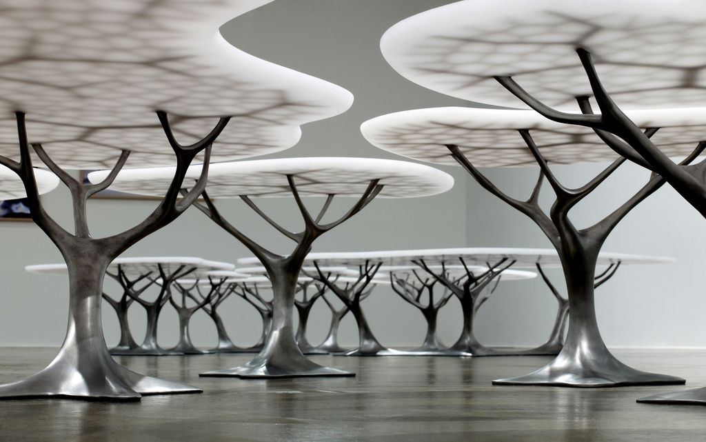 This coffee table is the smallest version in the Forest Table series, which is based on the Leaf Table concept. An algorithm mimicking cell division was used to create the pattern on the table top and as a result, the branching pattern differs in each table. The legs evoke branches and tree trunks.