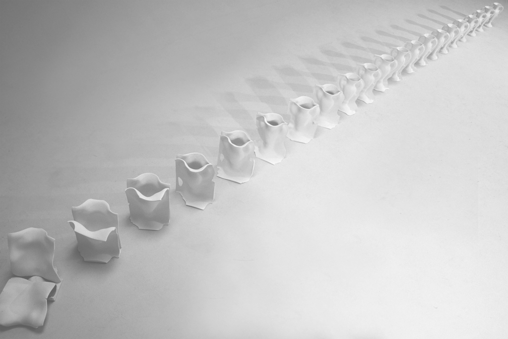 Mass-manufactured ceramic objects are traditionally cast in plaster molds, which break down after about 60 uses. This series of ceramic vases shows the deterioration of the mold; each cast vase is eroded more than the last. Despite the seeming identicality celebrated in mass manufacturing, Limited highlights the limits of this production process.