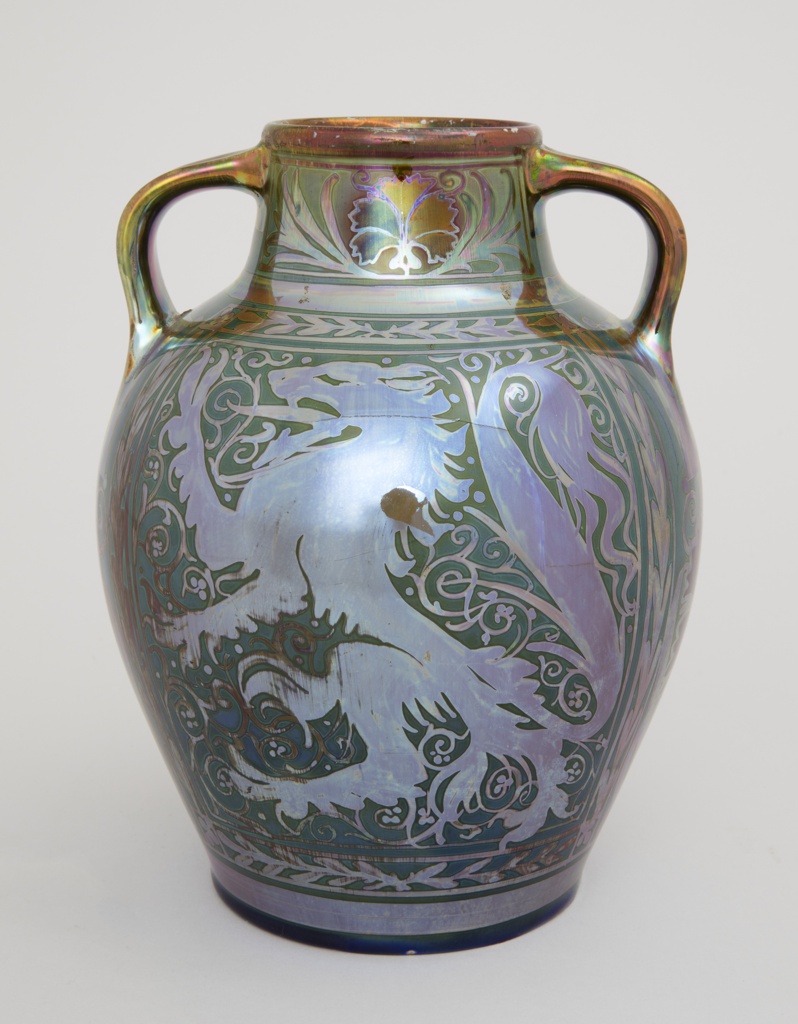 Gordon Mitchell Forsyth, art director of Pilkington’s ceramic firm in northern England from 1906 to 1919, oversaw the pottery’s development of a series of high luster glazes. The moniker “Lancastrian” was used for the new metallic glaze, after the firm’s location in the county by the same name. This vase’s decoration of heraldic lions and winding foliage is in keeping with the medieval tendencies of Pre-Raphaelite pottery.