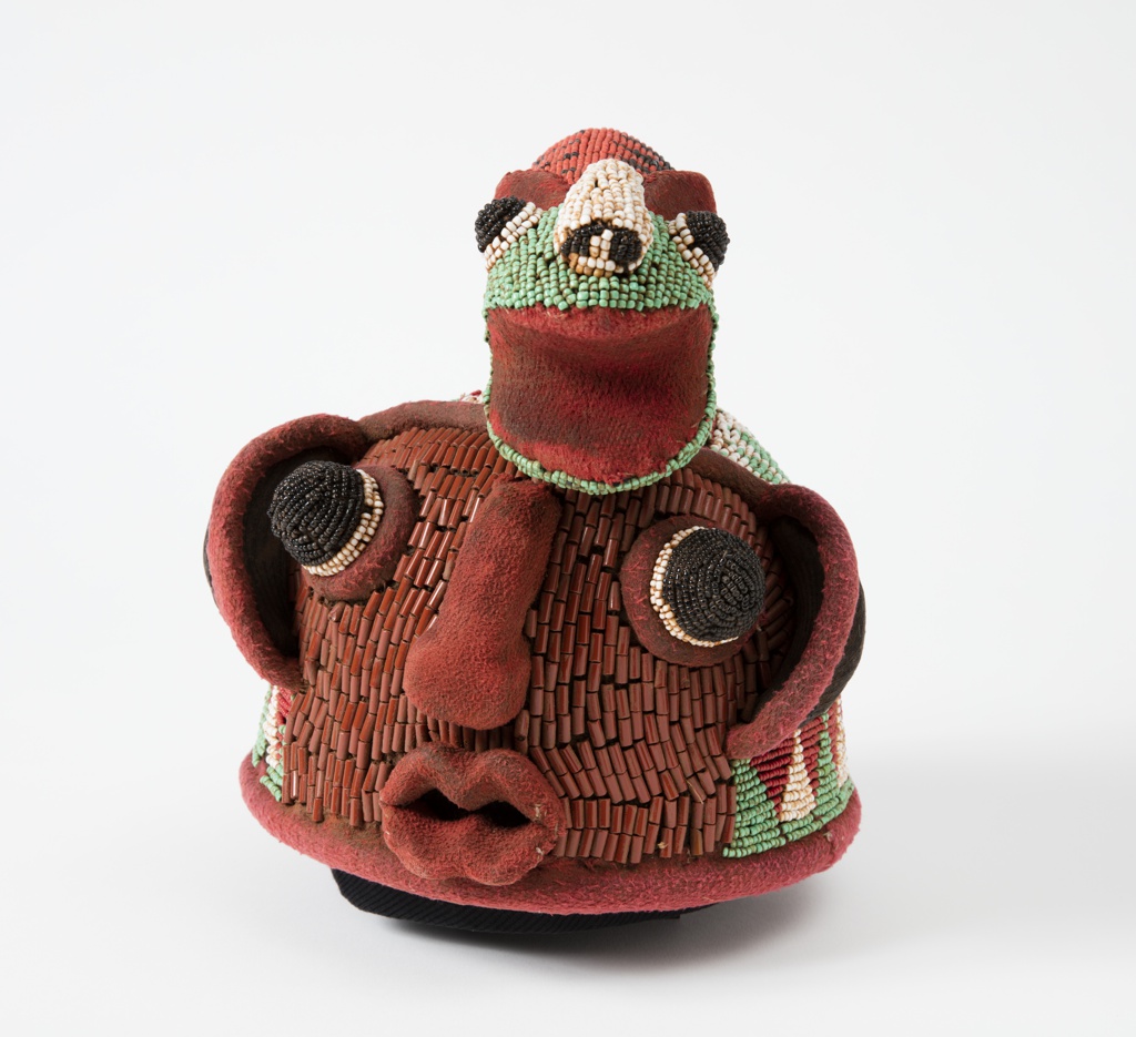 Ceremonial Hat; Made by Bamileke People; basketry covered with acrylic and acetate cloths, embroidered with glass beads; H x diam.: 20.3 × 22.9 cm (8 × 9 in.); Gift of Gail Martin; 2017-63-1