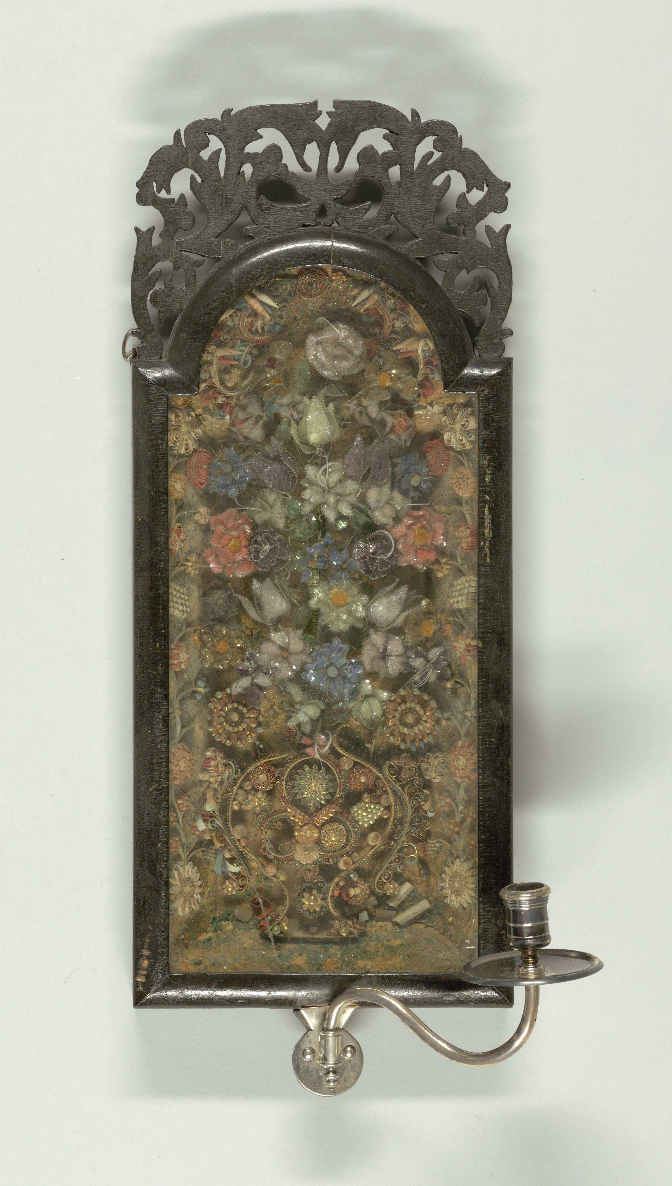 This is a Sconce. It is dated ca. 1720 and we acquired it in 1952. Its medium is quill-work, silver, glass, and black-painted pine. It is a part of the Product Design and Decorative Arts department.