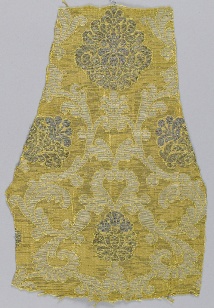 This is a Fragment. It is dated 16th century. Its medium is silk, silver foil, silk core wrapped with silver foil and its technique is compound twill, supplementary weft. It is a part of the Textiles department.