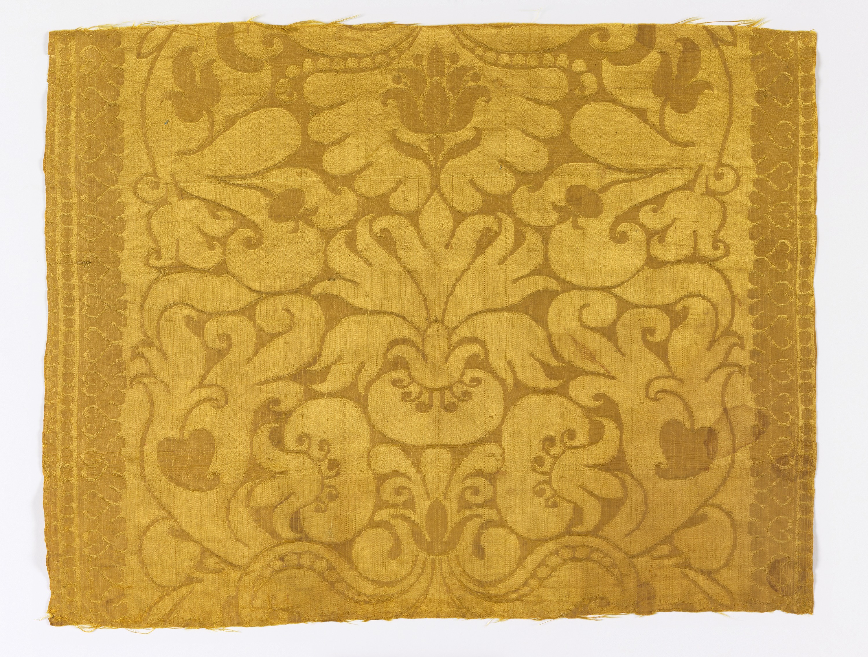 In March 1887, Eleanor and Sarah Hewitt purchased a group of European woven and embroidered textiles, lace, and costume from Mr. James Jackson Jarves’ collection of over six hundred and sixty pieces on sale at Ortgies Gallery, a Fifth Avenue auction house. The one hundred and fifty-five textiles they purchased that year became the first group of accessioned textiles for the Textile Department at Cooper Union in 1896. From this collection is a striking yellow silk damask with a symmetrical arrangement of large-scale stylized pomegranates and freely curving leaves and scrolls. The size of the motifs and woven side borders are an indication of its likely intended usage as a furnishing fabric.