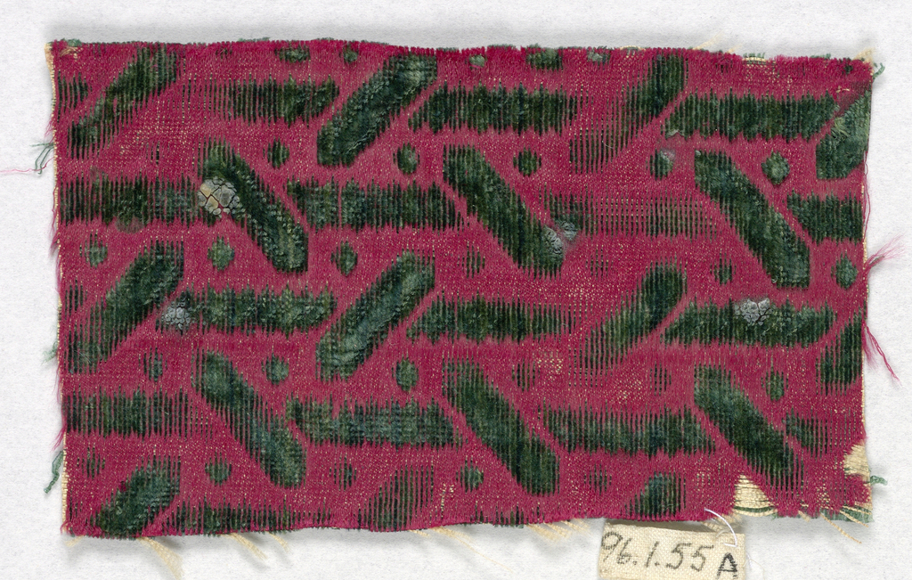 This is a Fragments. It is dated 17th century. Its medium is silk and its technique is supplementary warp forming raised pile in satin foundation (velvet). It is a part of the Textiles department.