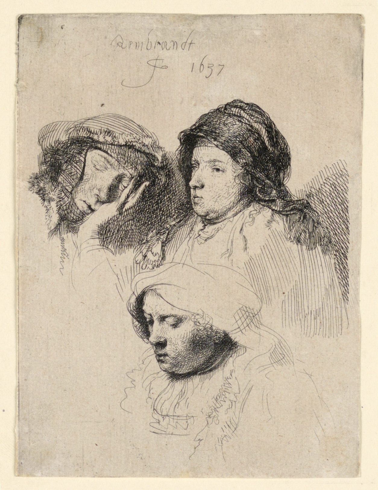 Print, Three Heads of Women, One Asleep; Rembrandt Harmensz van Rijn (Dutch, 1606–1669); Netherlands; etching on laid paper; 13.1 × 9.9 cm (5 3/16 × 3 7/8 in.); Bequest of George Campbell Cooper; 1896-3-186