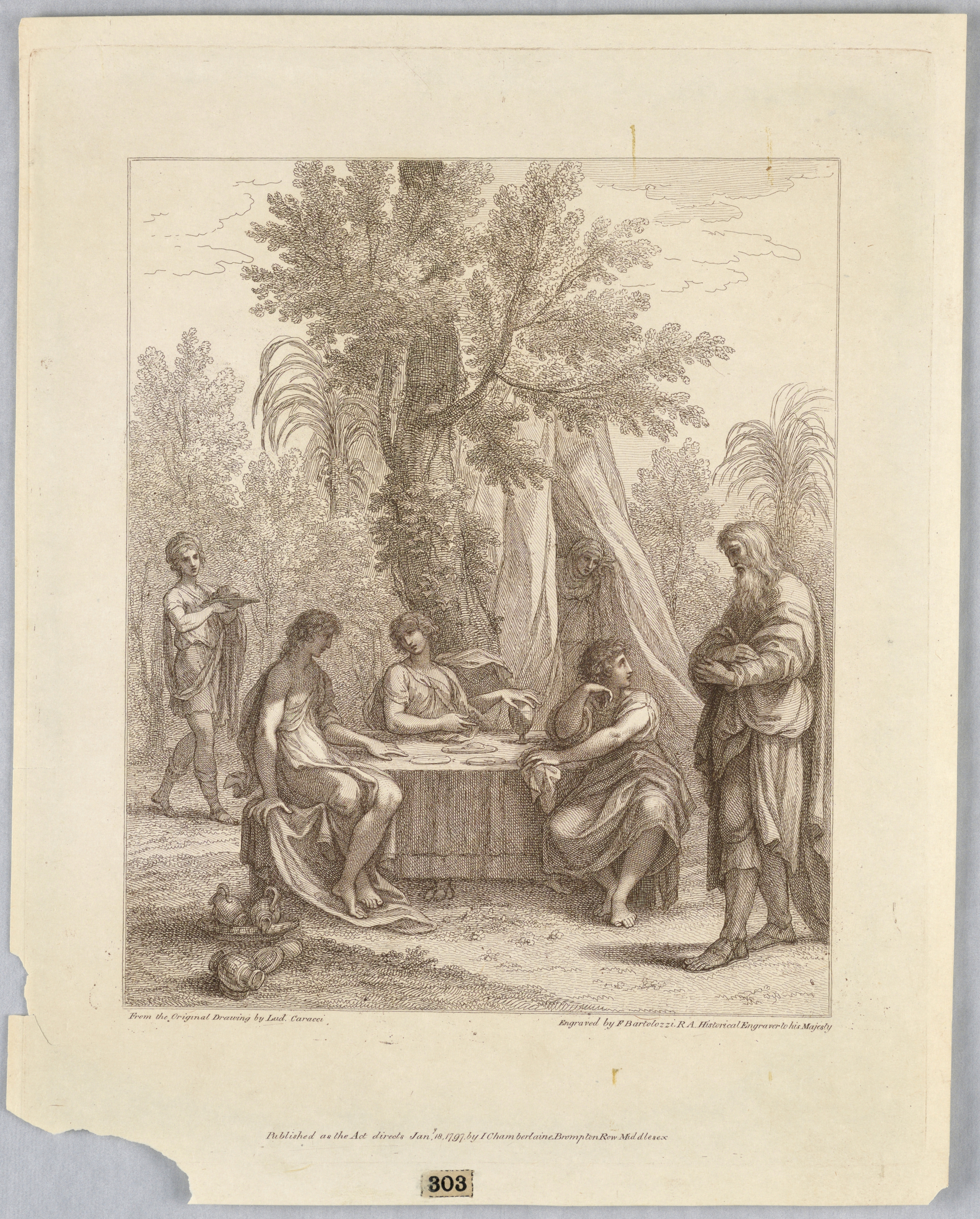 Print, Abraham Entertaining Three Angels; After Lodovico Carracci (Italian, 1555 - 1619); Published by John Chamberlaine (English, 1745 - 1812); Print Maker: Francesco Bartolozzi (Italian, 1727–1815); Italy; etching and line engraving in brown ink on white paper; 34.5 × 27.8 cm (13 9/16 × 10 15/16 in.); Bequest of George Campbell Cooper; 1896-3-302