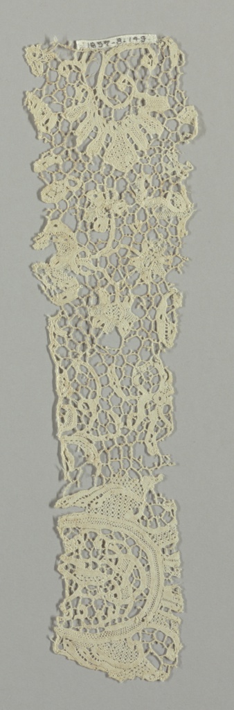 This is a Fragment. Its medium is linen and its technique is needle-made, late 17th to early 19th c. It is a part of the Textiles department.