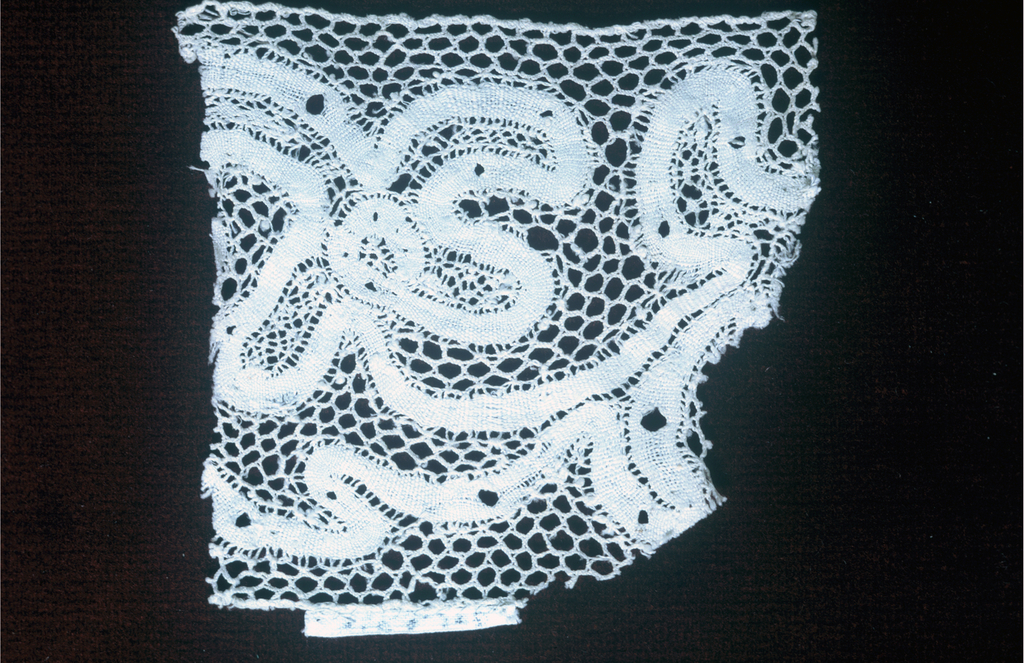 This is a Fragment. It is dated 17th century. Its medium is linen and its technique is bobbin made continuous tape with net added. It is a part of the Textiles department.