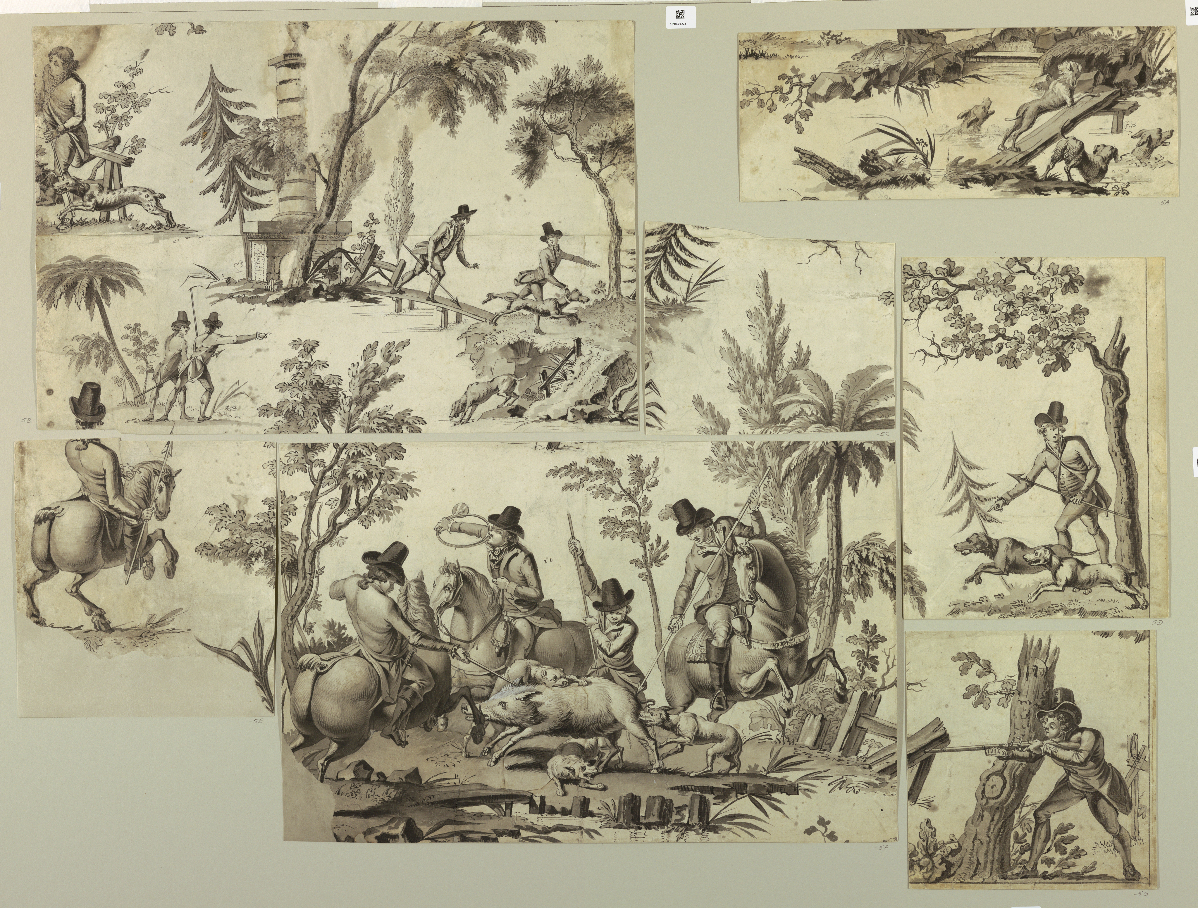 Drawing, Fragments of an incomplete cartoon for cotton printing: La Course au Sanglier; Claude-Louis Desrais (French, 1746–1816); Manufactured by Lafosse, Lionnet et Médard; pen and black ink with gray washes on paper; 65.7 × 90 cm (25 7/8 × 35 7/16 in.); Gift of Bridget Mahon; 1898-21-5-c