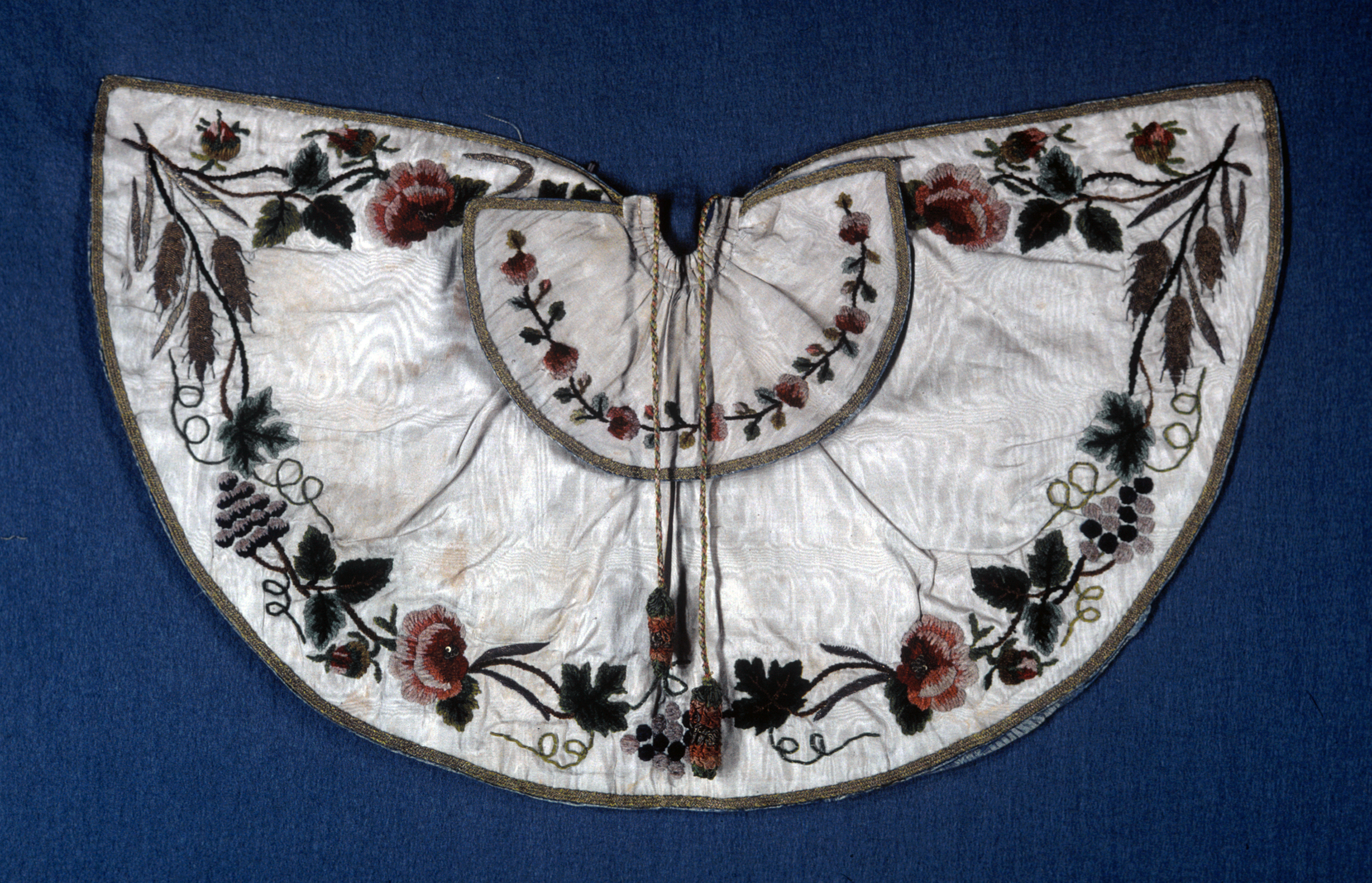 This is a Cape for an ecclesiastical figurine. It is dated 1750–99. Its medium is silk, metallic yarns, sequins and its technique is embroidered on moire. It is a part of the Textiles department.