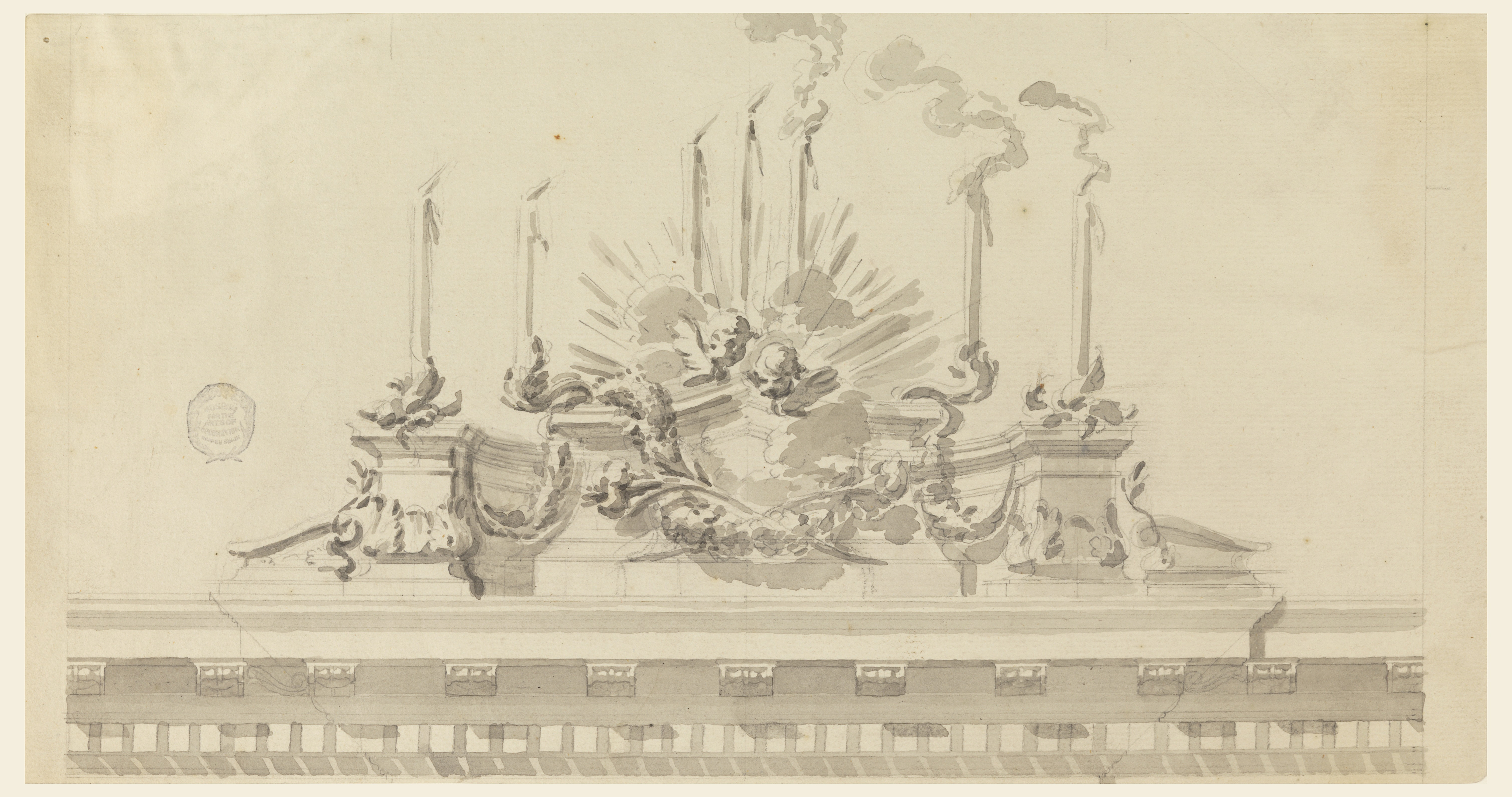 Drawing, Design for Decoration of a Ceremony; Carlo Marchionni (Italian, 1702–1786); Italy; black crayon, brush and gray watercolor on laid paper; 34.6 x 18.4 cm (13 5/8 x 7 1/4 in.); Museum purchase through gift of various donors; 1901-39-1005