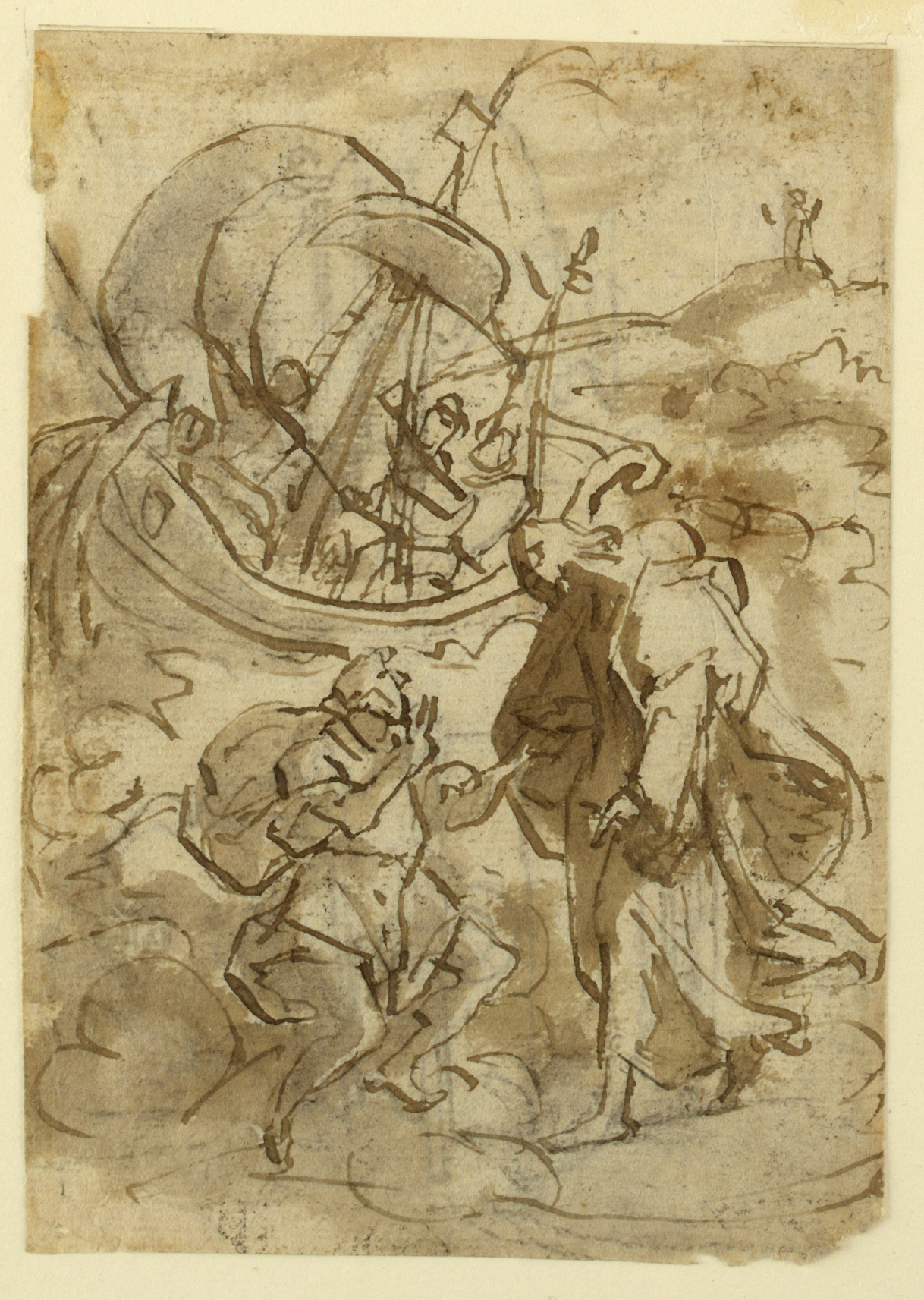 Drawing, Christ Saving Peter from Drowning; Jan van der Straet, called Stradanus (Flemish, 1523–1605); Netherlands; pen and ink, brush and brown and gray wash over black chalk on paper; 13.9 × 9.8 cm (5 1/2 × 3 7/8 in.); Museum purchase through gift of various donors; 1901-39-1067