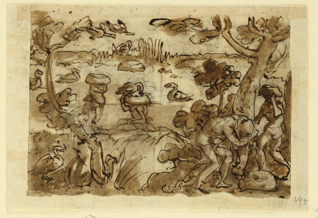 Drawing, Hunting Ducks using Pumpkins in the West Indies; Jan van der Straet, called Stradanus (Flemish, 1523–1605); Engraved by Hans Collaert II (Flemish, 1560 - 1628), Cornelis Galle I; Published by Philips Galle (Flemish, 1537 - 1612); Subject: Gonzalo Fernándo de Oviedo y Valdés (Spanish, 1478 – 1557); Netherlands; pen and ink, brush and brown wash on laid paper; H x W: 10.1 × 13.8 cm (4 in. × 5 7/16 in.); Museum purchase through gift of various donors; 1901-39-131