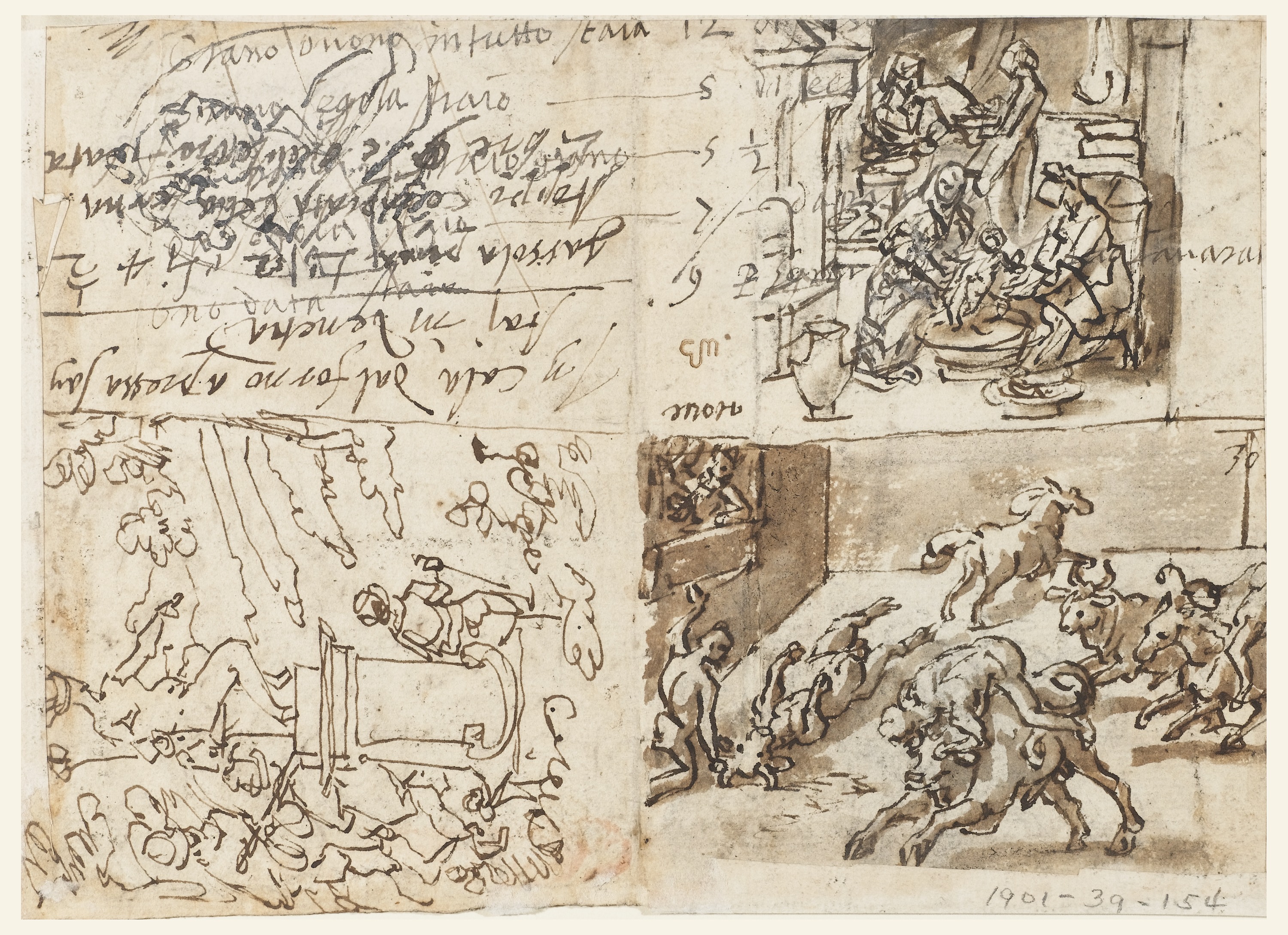 Drawing, Theagenes taming the Bull in Ethiopia [above left]; Theagenes taming the Bull in Ethiopia [below left]; Dragon Hunt in India [above right]; Dragon Hunt in India [below right].; Jan van der Straet, called Stradanus (Flemish, 1523–1605); Subject: Philostratus, The Athenian (Greek, 170 - 247 CE); Italy; pen and brown ink, brush and brown and black wash over black chalk on off-white laid paper; 15.2 x 22.2 cm (6 x 8 3/4 in.); Museum purchase through gift of various donors; 1901-39-154