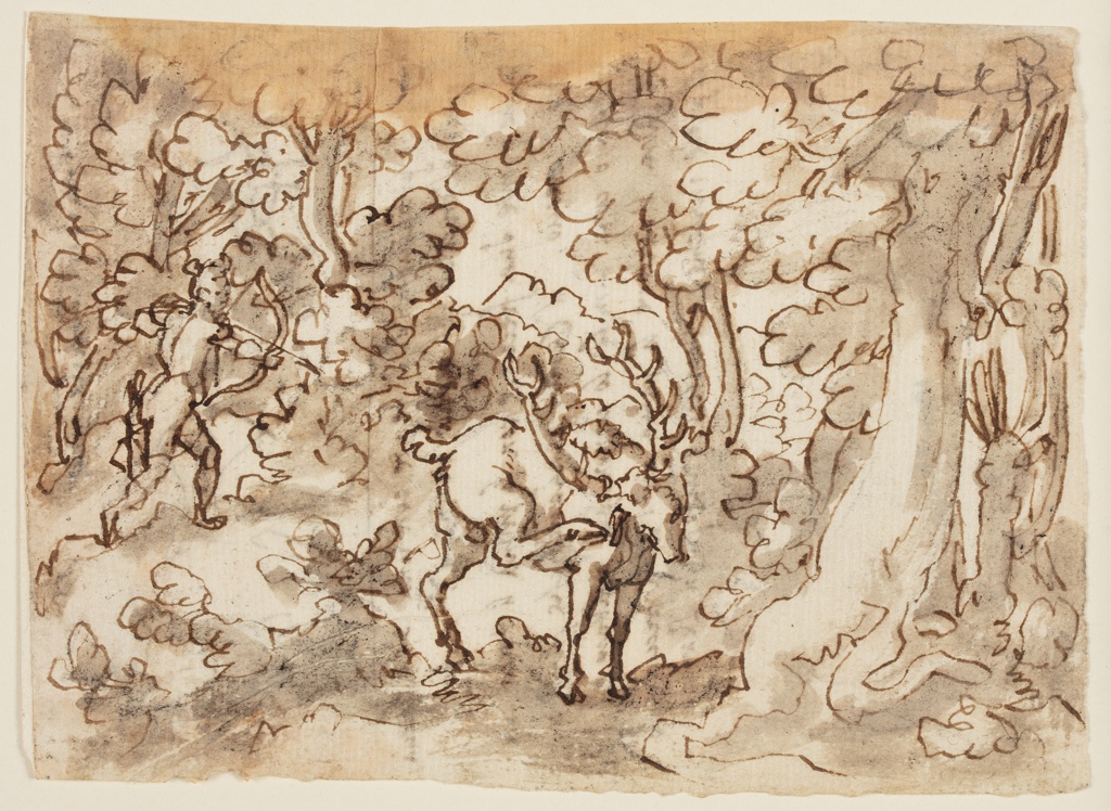 Drawing, Deer Hunt with Bow and Arrow; Jan van der Straet, called Stradanus (Flemish, 1523–1605); Engraved by Hans Collaert II (Flemish, 1560 - 1628); Published by Philips Galle (Flemish, 1537 - 1612); Collaborator: Luigi Alamanni (Italian, 1558–1603); Netherlands; pen and brown ink, brush and wash on laid paper.; 11.1 × 14.1 cm (4 3/8 × 5 9/16 in.); Museum purchase through gift of various donors; 1901-39-160