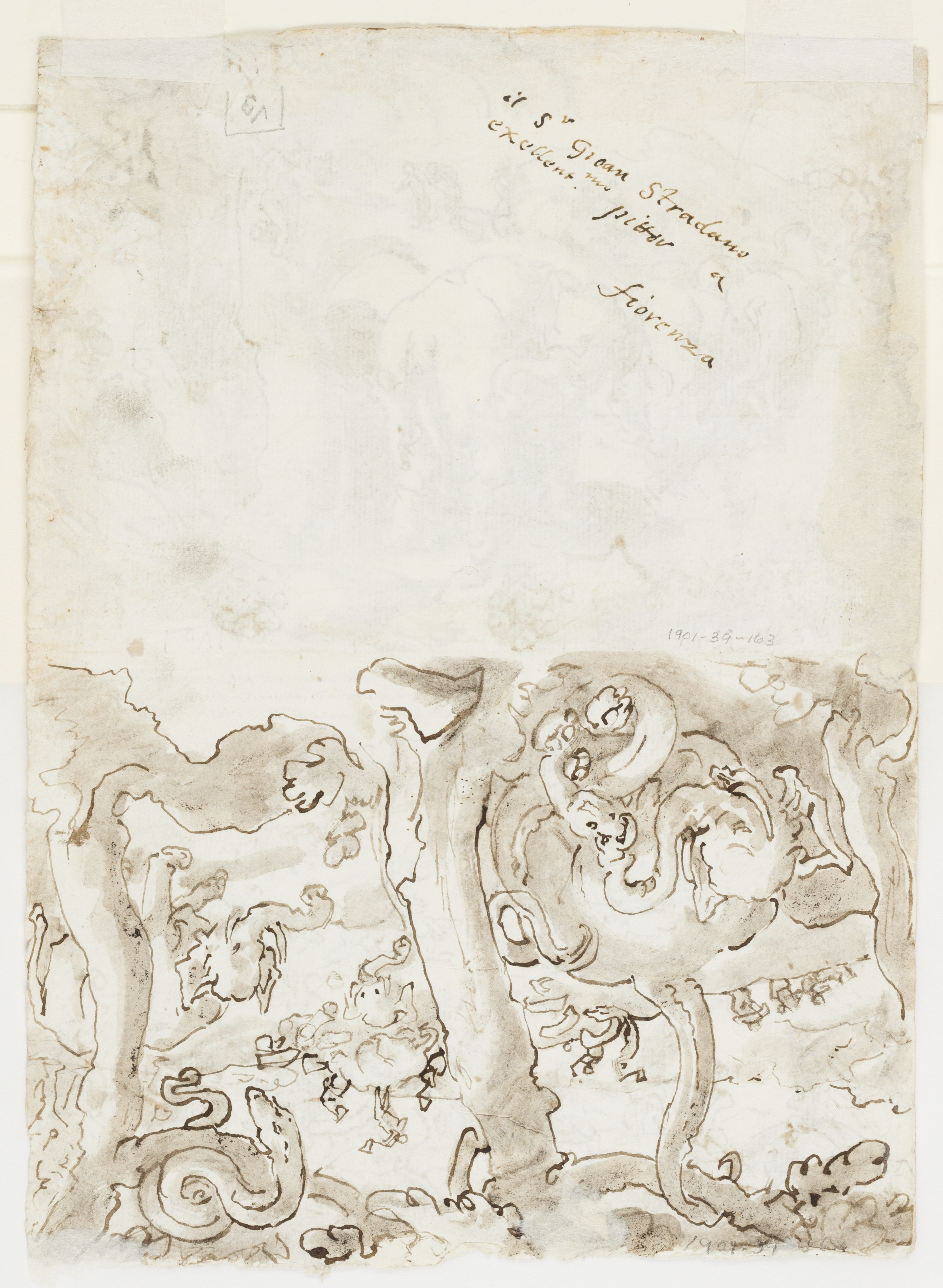 Recto, inscribed in pen and ink: "Il Re di Persia nelle caccie sta nel mezzo dell'isola, che e / circondata da una cercia di cacciatori che accertandosi uniti verso / il re, tutte le le fiere vanno al mezzo verso il re. ex Herodote--" [in the hand of Luigi Alamanni] "mare" [in the hand of the artist] Verso, inscribed in pen and ink: "Il Sr Gioan Stradano / exellent.mo pittor a / fiorenza" [in the hand of Luigi Alamanni]