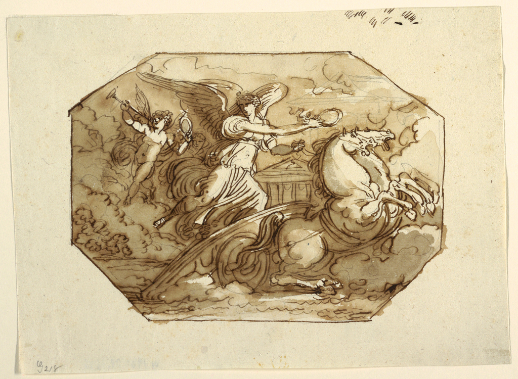 Drawing, Fame or Victory in a Chariot, Sala di Nike, Palazzo Naldi, Faenza; Designed by Felice Giani (Italian, 1758–1823); Italy; pen and brown ink, brush and brown wash over black chalk on laid paper; 24.9 x 18.7 cm (9 13/16 x 7 3/8 in.); Museum purchase through gift of various donors; 1901-39-1646