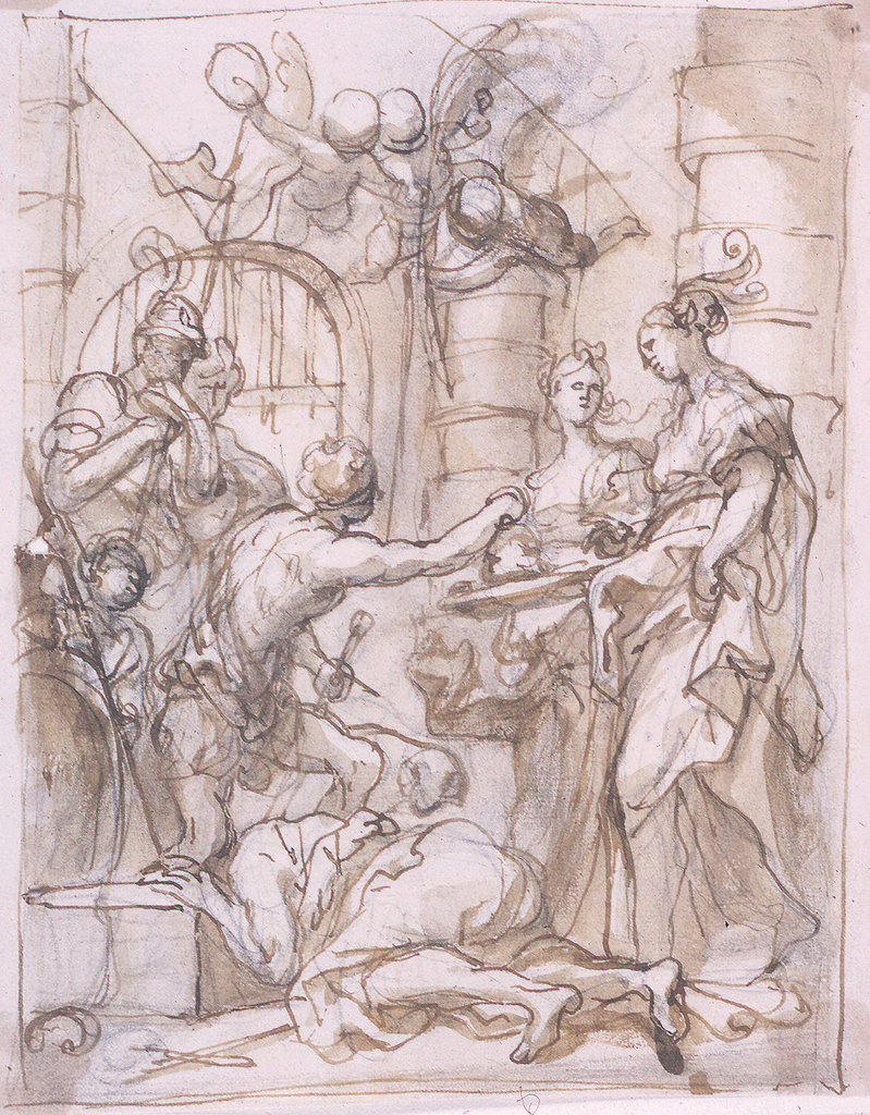 Drawing, Salome Receives the Head of St. John the Baptist; Domenico Piola (Italian, 1627 - 1703); Italy; black crayon, pen and ink, brush and sepia wash on paper; H x W: 19.9 × 15.9 cm (7 13/16 × 6 1/4 in.); Museum purchase through gift of various donors; 1901-39-170
