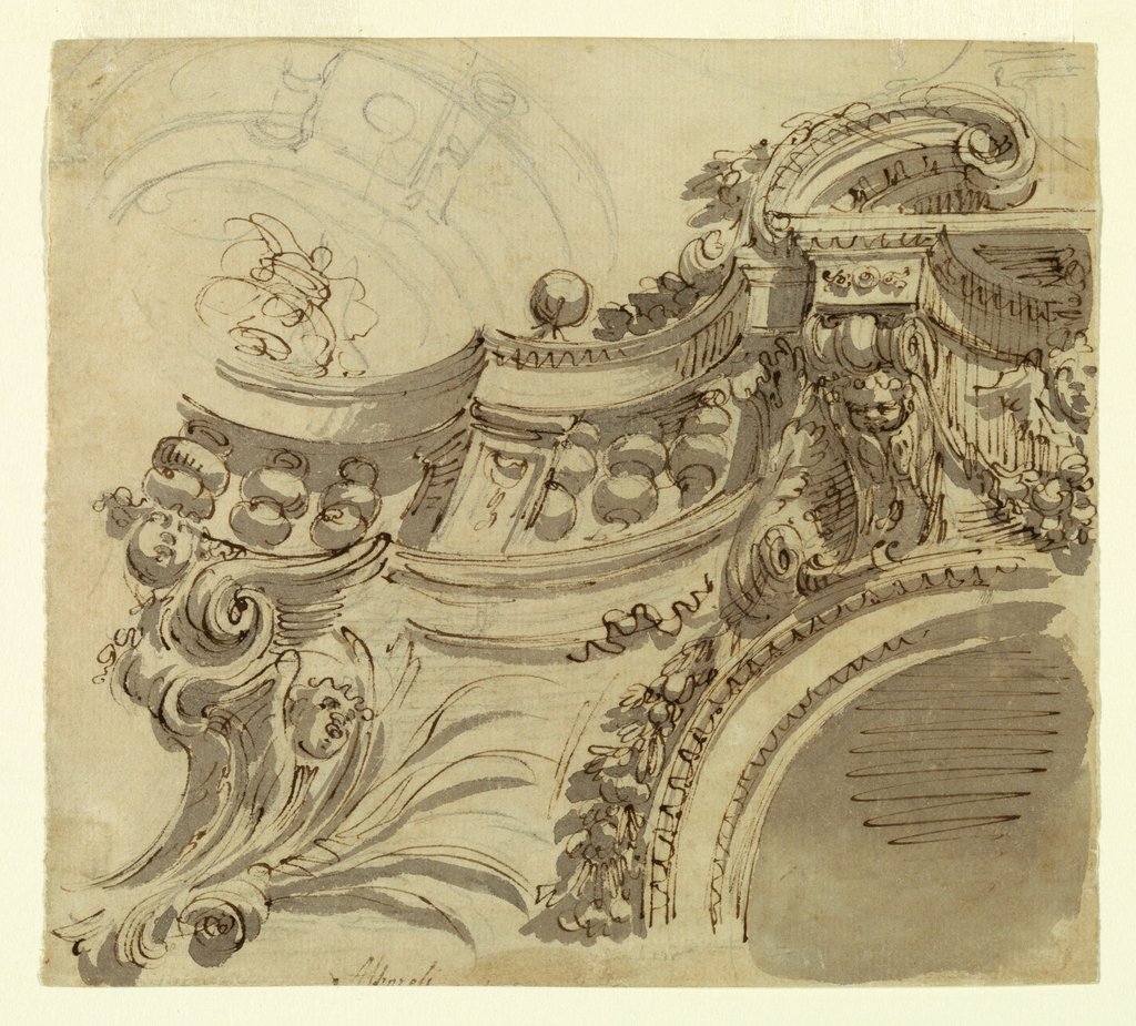 Drawing, Design for a Ceiling with Balustrade; Attributions: Giacomo Alboresi (1632–1677); Italy; pen and brown ink, brush and gray wash, black chalk on white laid paper; 17.6 x 19.7 cm (6 15/16 x 7 3/4 in.) Mat: 35.6 x 45.7 cm (14 x 18 in.); Museum purchase through gift of various donors; 1901-39-1707