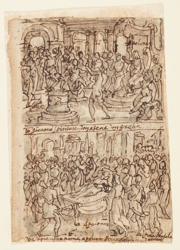 Drawing, Apollonius Curing a Young Athenian Possessed of a Demon [above]; Apollonius Raising a Girl from the Dead in Rome [below]; Jan van der Straet, called Stradanus (Flemish, 1523–1605); Subject: Philostratus, The Athenian (Greek, 170 - 247 CE); Netherlands; pen and brown ink, brush and brown wash on paper; 14.6 × 10.1 cm (5 3/4 in. × 4 in.); Museum purchase through gift of various donors; 1901-39-2022