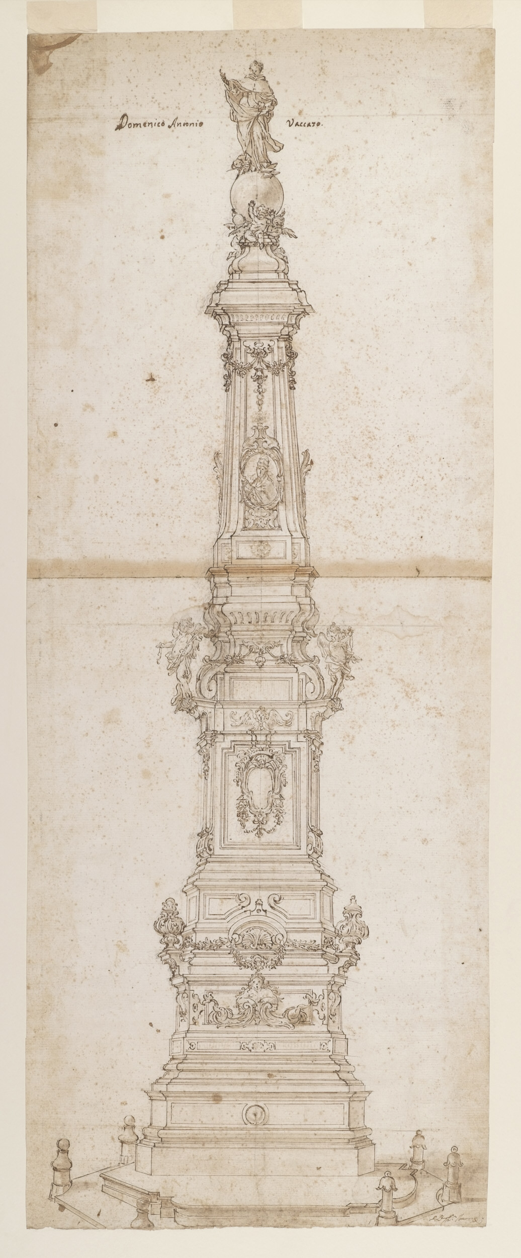 Drawing, Design for the Obelisk of St. Dominic, Piazza San Domenico Maggiore, Naples; Domenico Antonio Vaccaro (Italian, 1678–1745); Italy; pen and brown ink, brush and brown wash, black chalk on cream laid paper; 80.2 x 30.8 cm (31 9/16 x 12 1/8 in. ); Museum purchase through gift of various donors; 1901-39-218