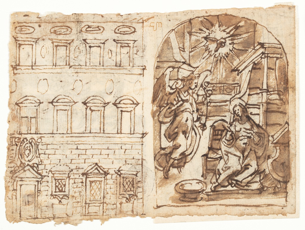 Drawing, Elevation of Palazzo Pazzi dell' Accademia Colombaria [left]; Annunciation [right]; Jan van der Straet, called Stradanus (Flemish, 1523–1605); Netherlands; pen and brown ink, brown wash on off-white laid paper; 10.7 x 15 cm (4 3/16 x 5 7/8 in.); Museum purchase through gift of various donors; 1901-39-2642