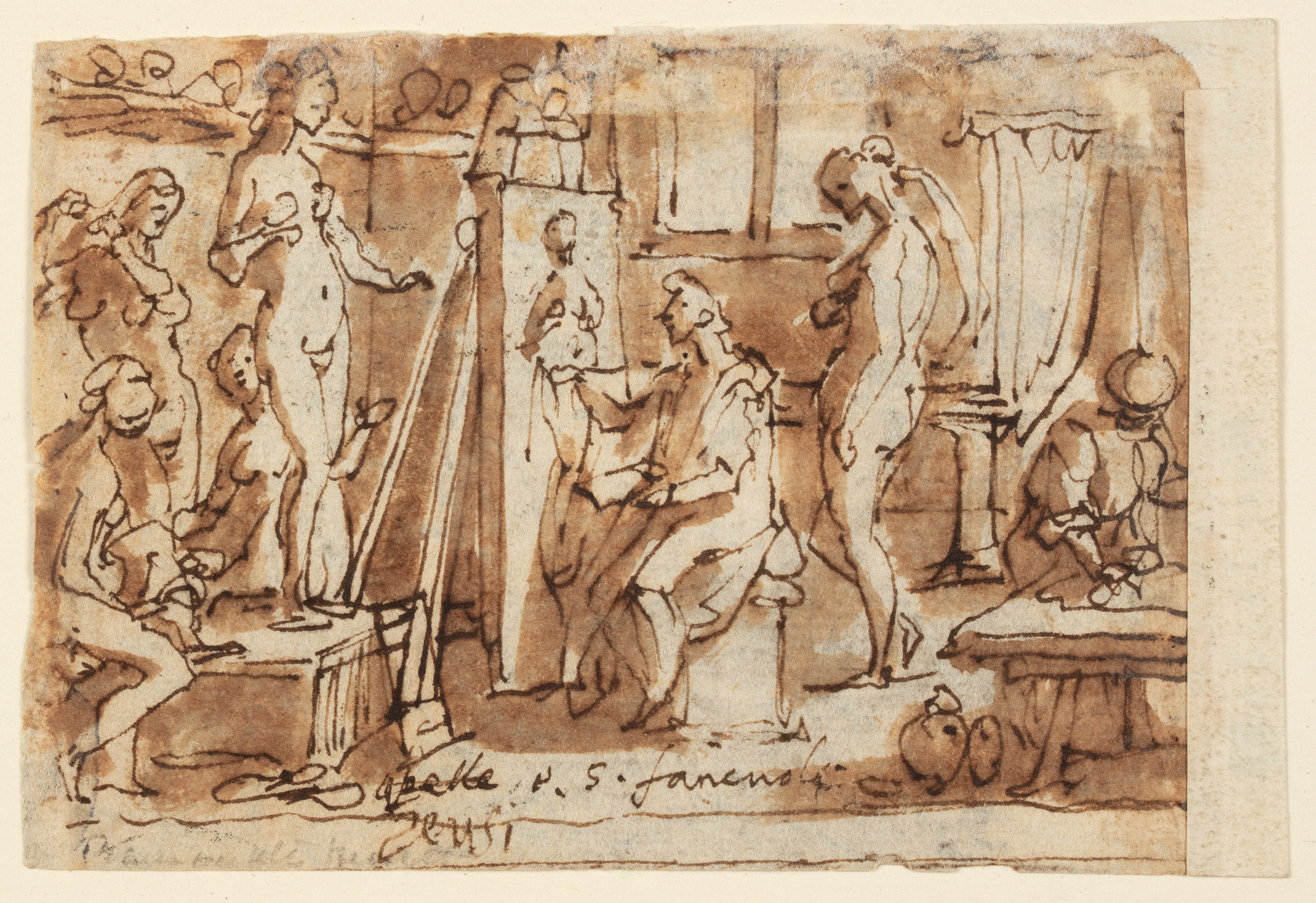 Drawing, Zeuxis painting Helen; Jan van der Straet, called Stradanus (Flemish, 1523–1605); Netherlands; pen and brown ink, brush and wash on laid paper ; 9.9 × 7 cm (3 7/8 × 2 3/4 in.); Museum purchase through gift of various donors; 1901-39-2651