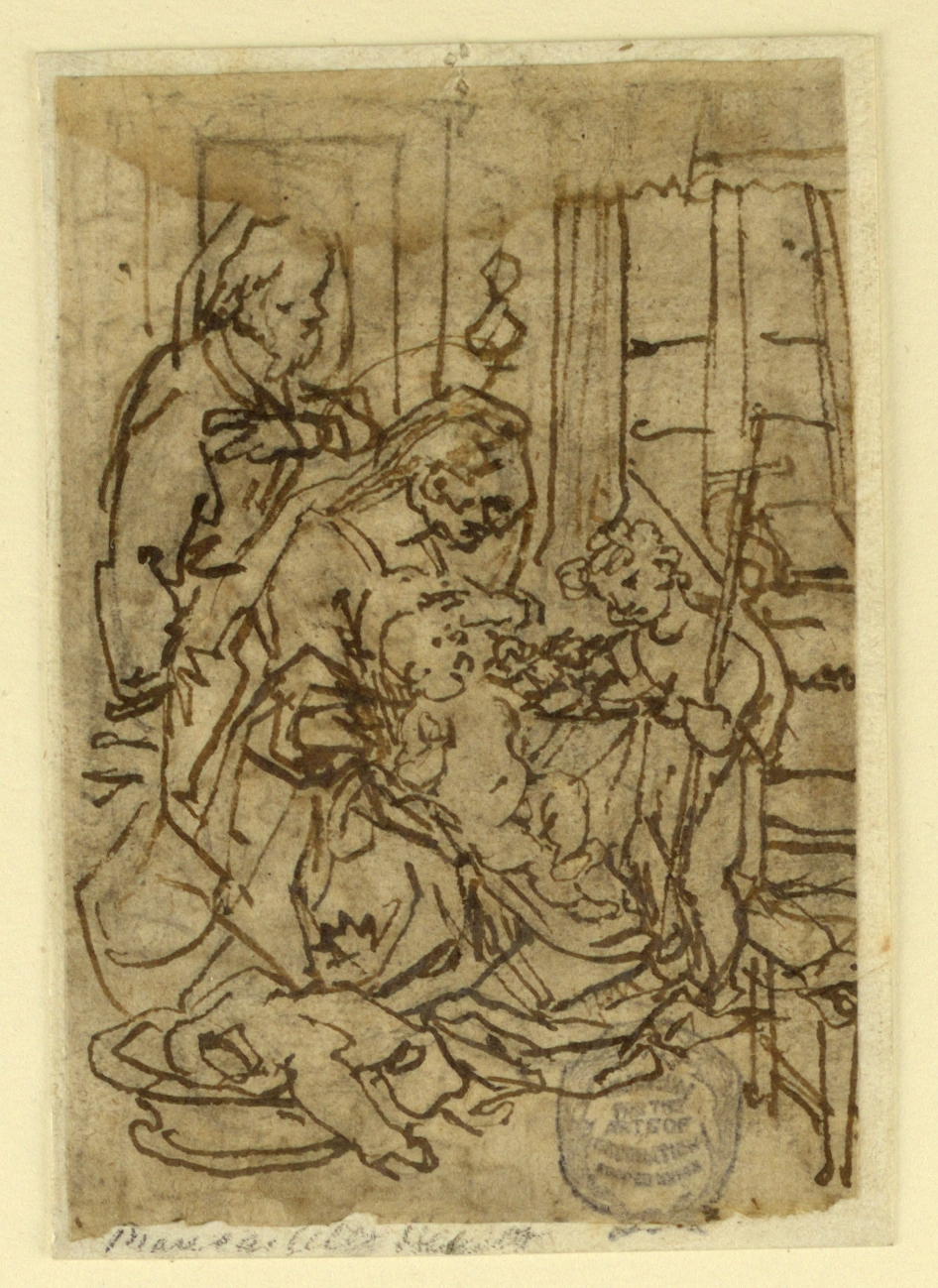 Drawing, The Holy Family with John the Baptist; Jan van der Straet, called Stradanus (Flemish, 1523–1605); Netherlands; pen and ink on laid paper; 10 x 6.9 cm (3 15/16 x 2 11/16 in.); Museum purchase through gift of various donors; 1901-39-2672
