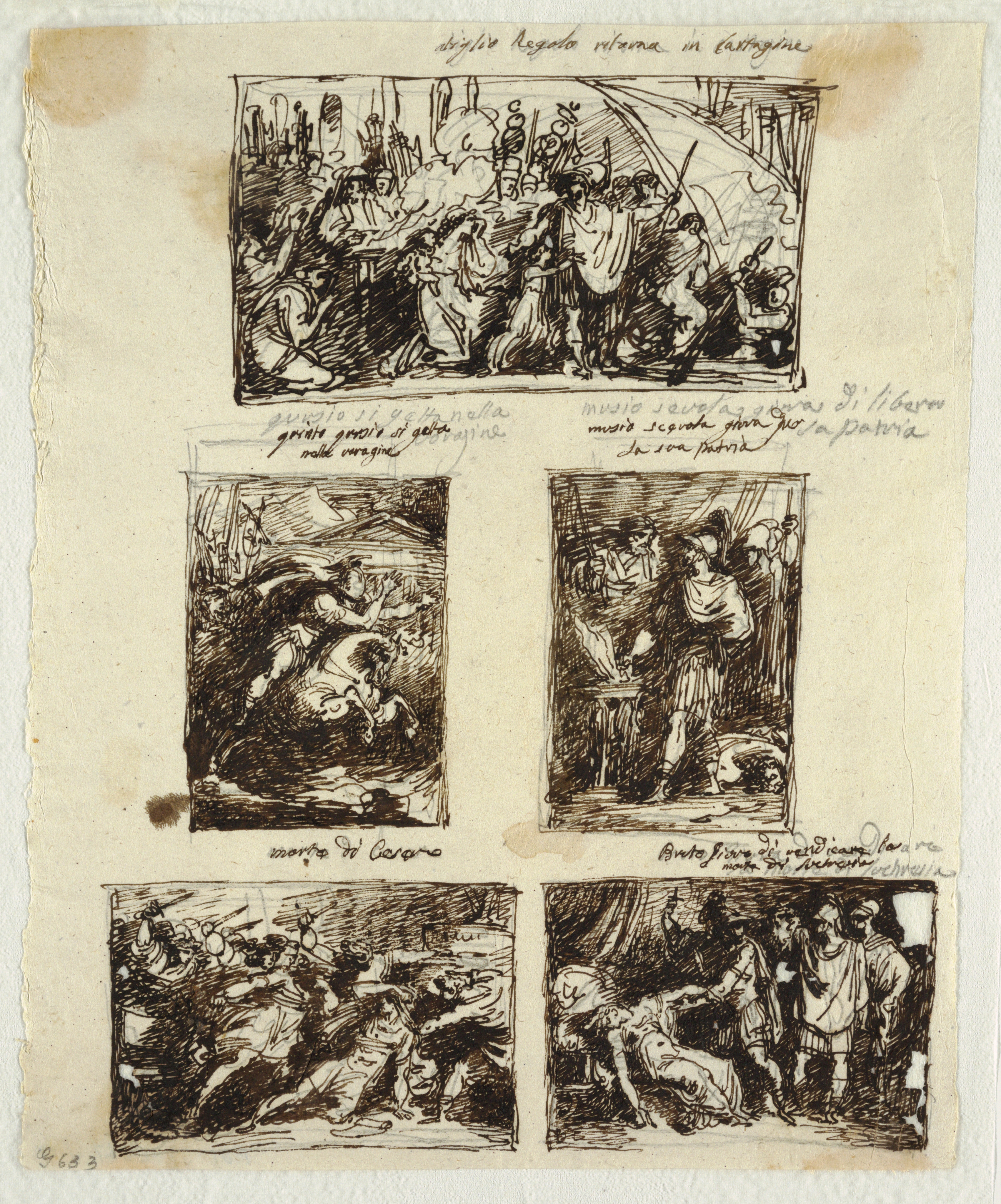 In pen and brown ink, left row: Sacrificio alla Pace; center: Trionfo delle armi; below: segnifero Romano. Central row: Coriolano alle mura di Roma; Banaditore delle leggi Romane.
