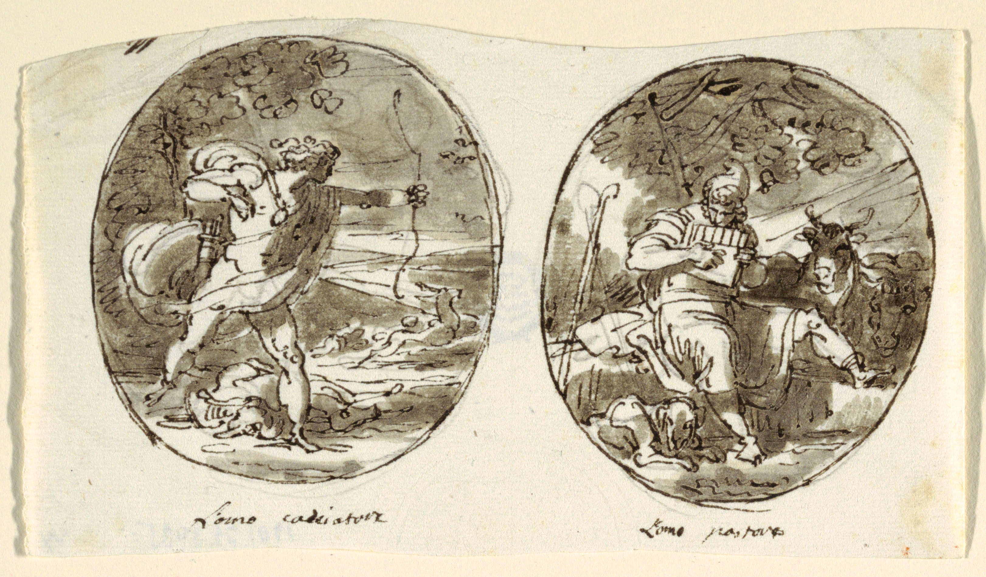Inscription in two ovals: L'omo cacciatore, L'omo pastore.