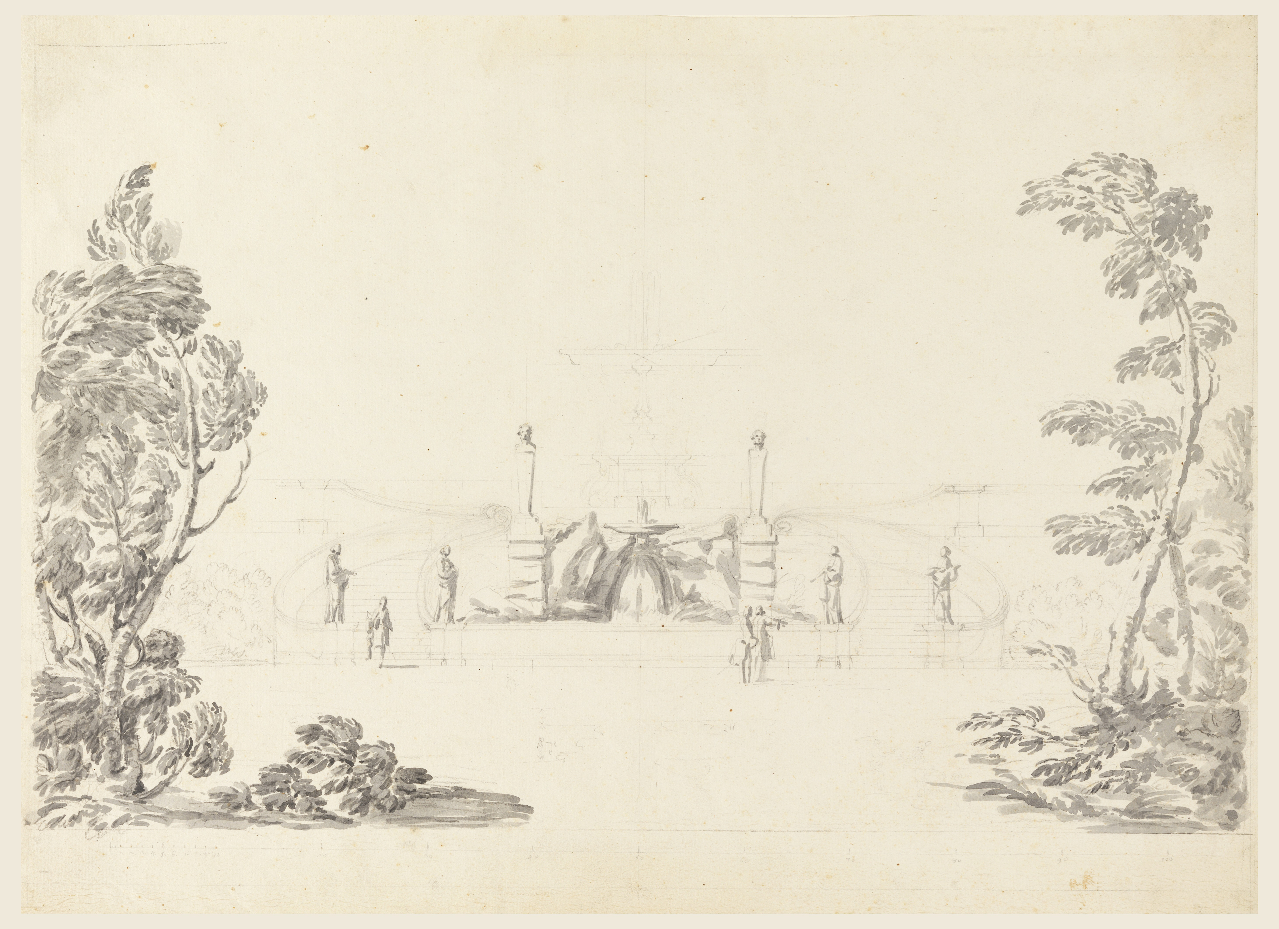 Drawing, Sketch for a Fountain in Park; Carlo Marchionni (Italian, 1702–1786); Italy; graphite, brush and gray watercolor on laid paper; 48.5 x 35.4 cm (19 1/8 x 13 15/16 in.); Museum purchase through gift of various donors; 1901-39-404