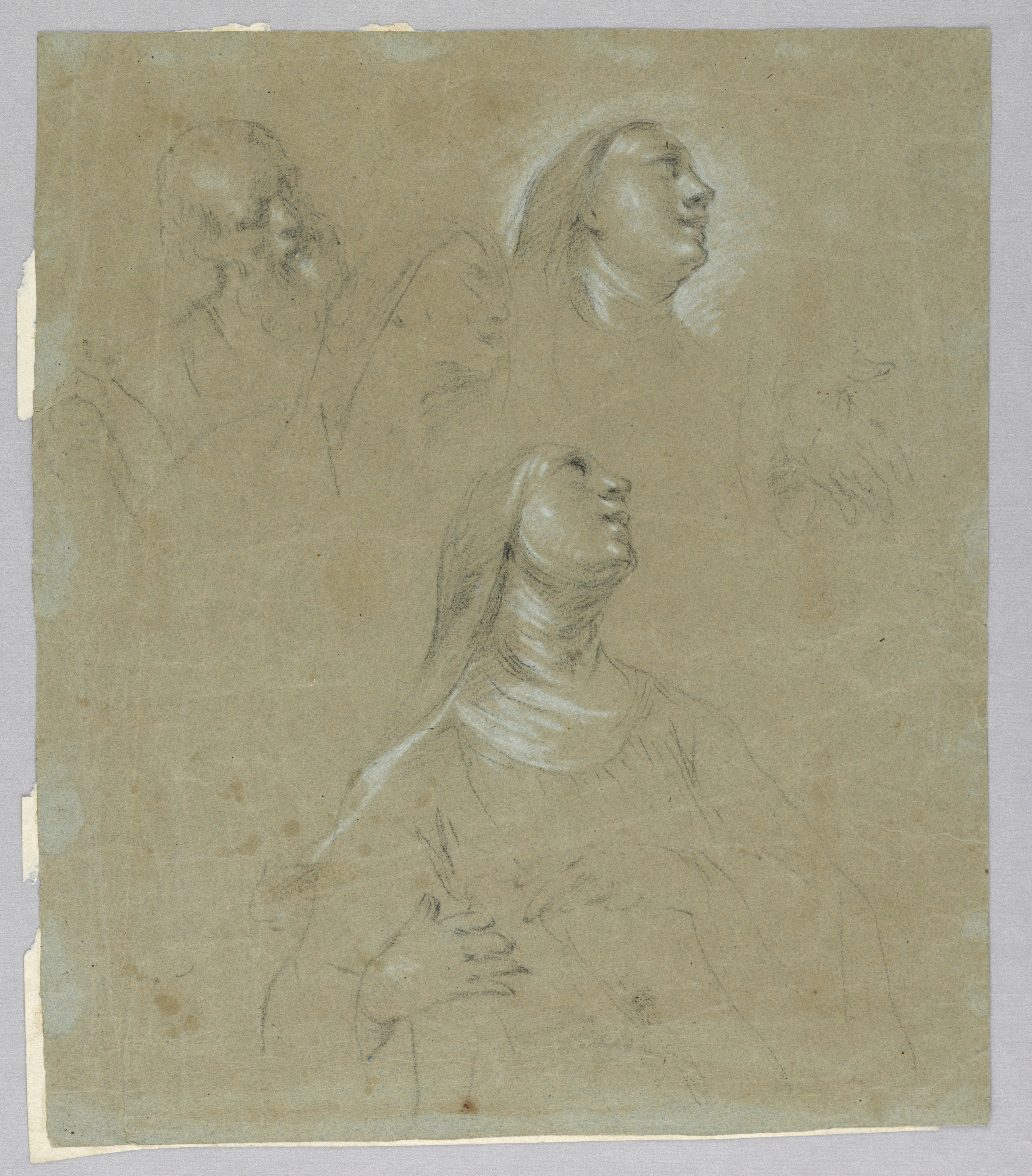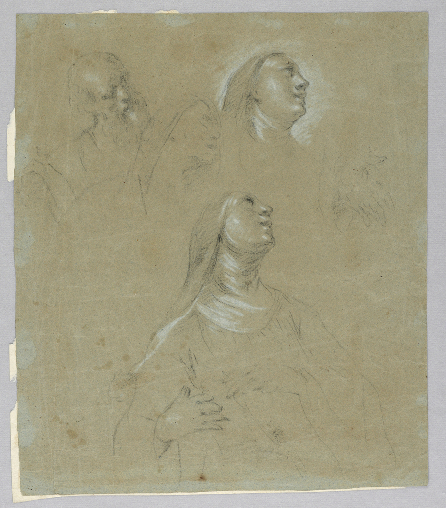 Drawing, Studies for Holy Figures; Italy; clack crayon, white heightening on gray paper; H x W: 31.5 × 26.9 cm (12 3/8 × 10 9/16 in.); Museum purchase through gift of various donors; 1901-39-44
