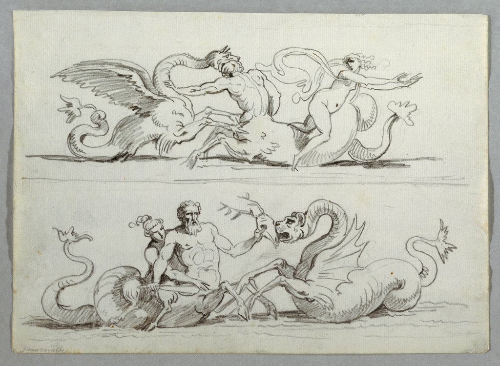 Drawing, Sea Cintaur Combats Sea Monster; Italy; pen and brown ink, graphite on cream laid paper; 23.6 × 24.5 cm (9 5/16 × 9 5/8 in.); Museum purchase through gift of various donors; 1901-39-498
