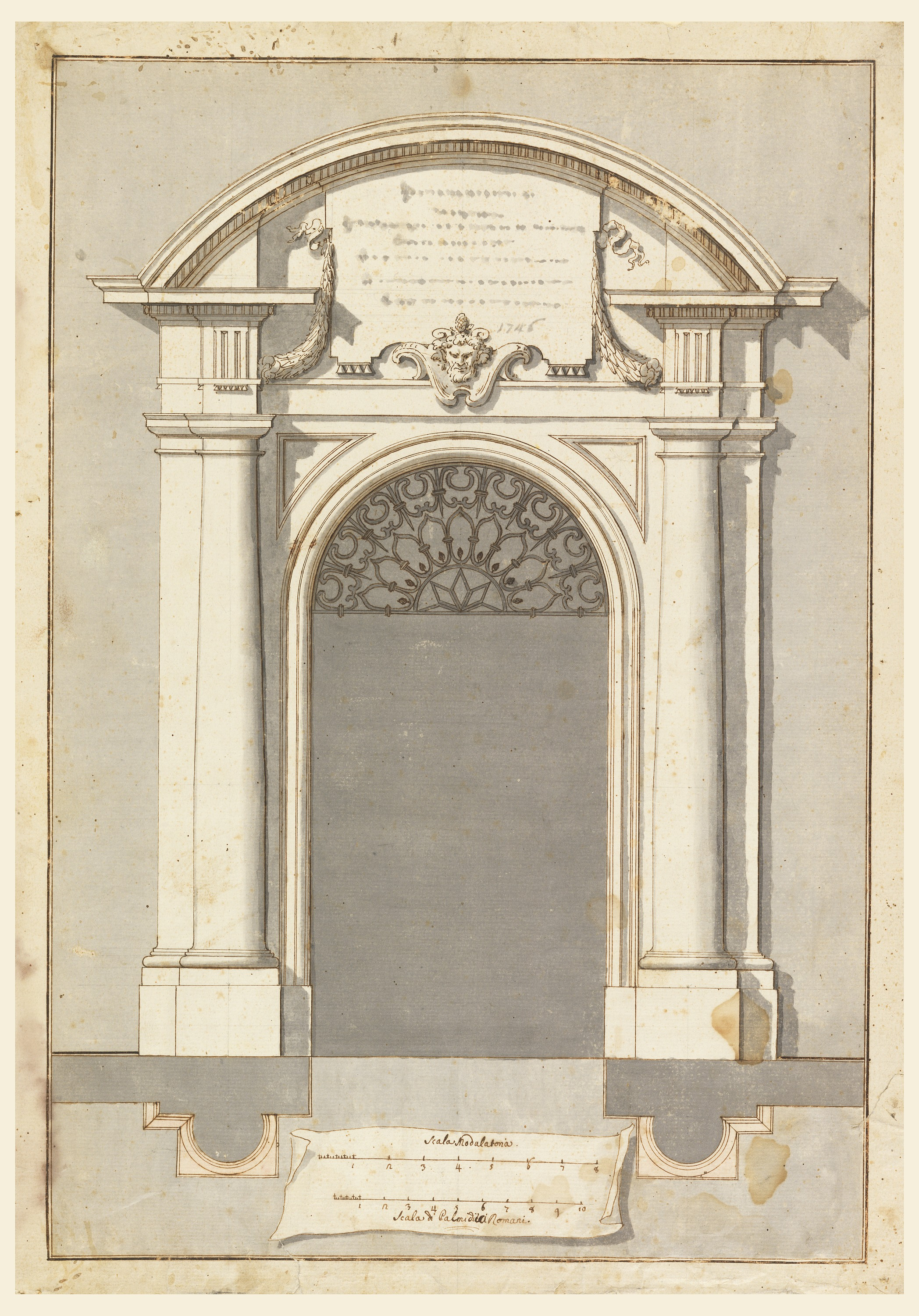 Drawing, Design for a door with arched pediment; Carlo Marchionni (Italian, 1702–1786); Italy; pen and black ink, brush and sepia, gray watercolor; 52.5 x 37 cm (20 11/16 x 14 9/16 in.); Museum purchase through gift of various donors; 1901-39-613