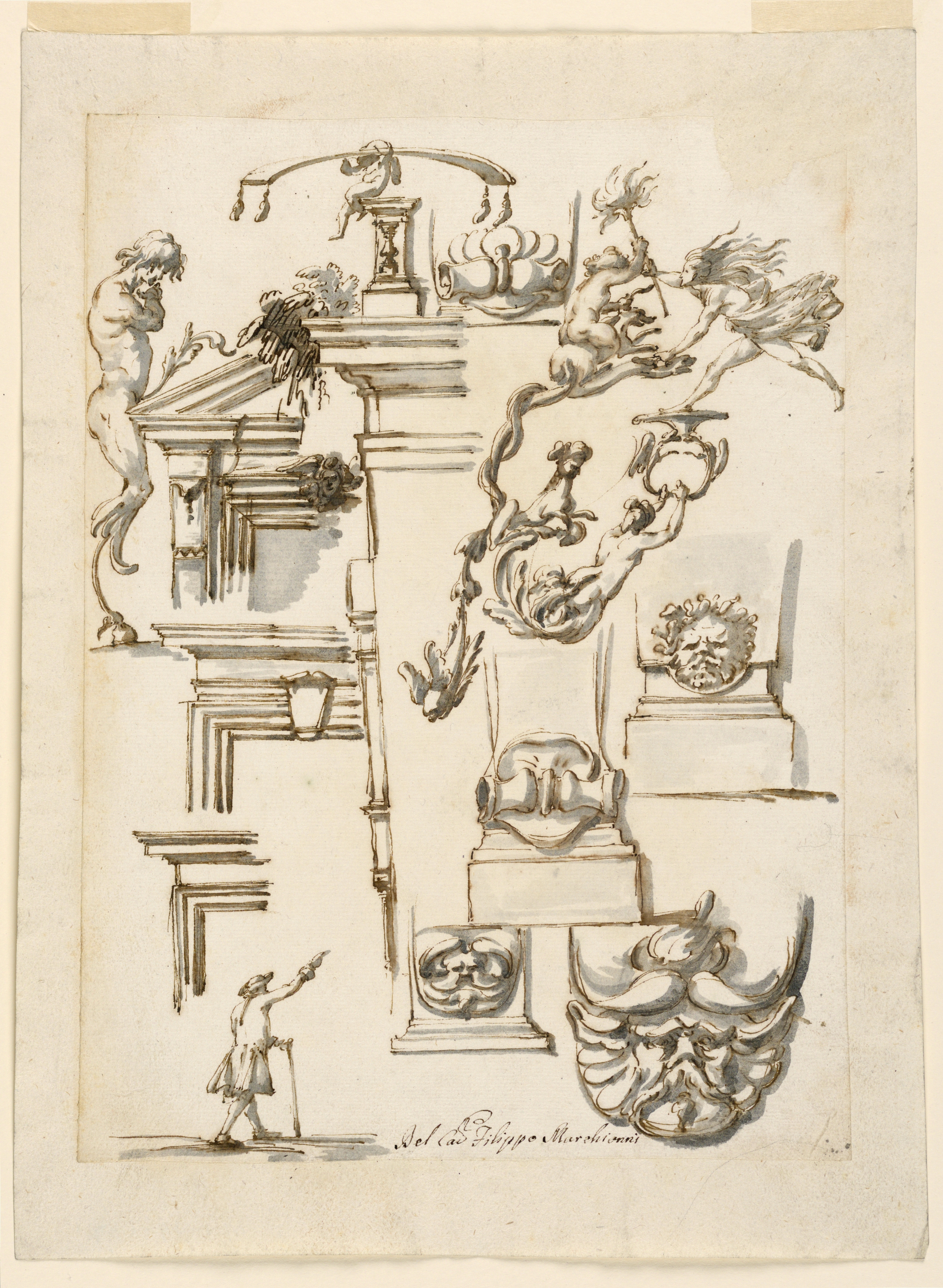 Drawing, Architectural Details and Figure Study; Designed by Filippo Marchionni (Italian, 1732–1805); Italy; pen and ink, brush and gray watercolor on laid paper; 27.6 x 20.4 cm (10 7/8 x 8 1/16 in.); Museum purchase through gift of various donors; 1901-39-647