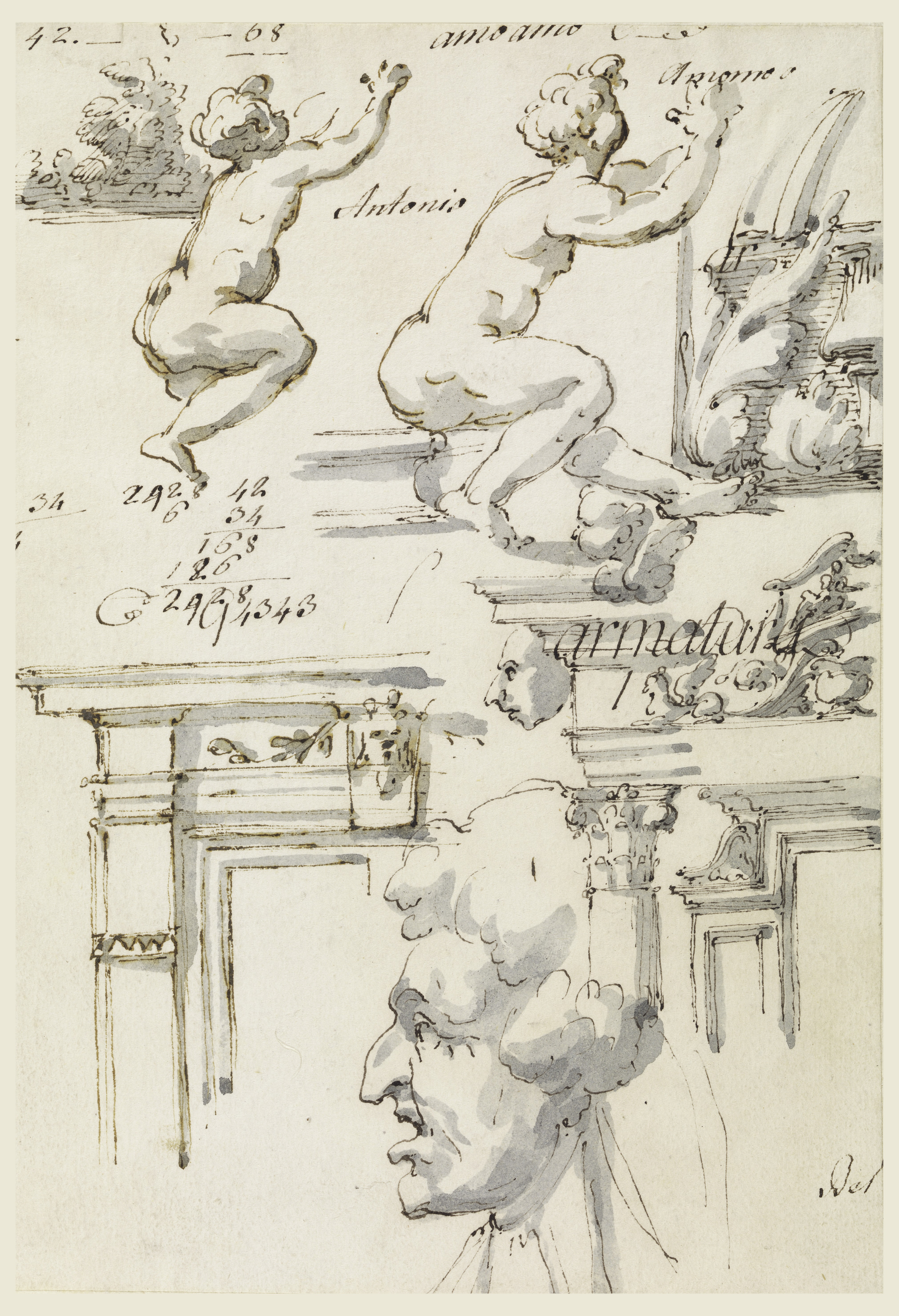 Drawing, Architectural Details and Figure Studies; Designed by Filippo Marchionni (Italian, 1732–1805); Italy; pen and black, sepia ink, brush and gray watercolor on cream laid paper; 20.5 x 14.4 cm (8 1/16 x 5 11/16 in.); Museum purchase through gift of various donors; 1901-39-651