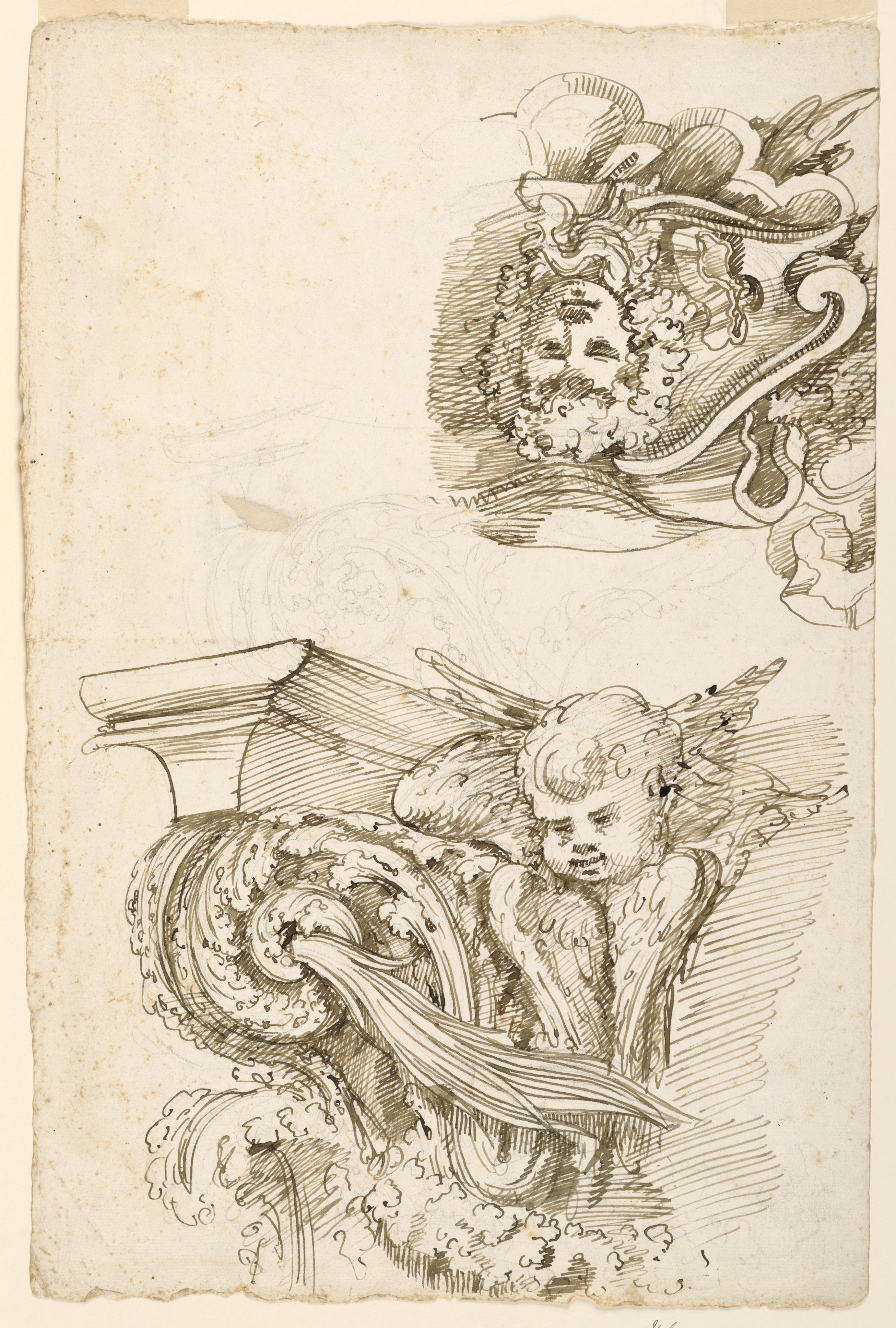 Drawing, Architectural Sculptures; Italy; brush and brown ink, traces of graphite on off-white laid paper; H x W: 43.7 × 29 cm (17 3/16 × 11 7/16 in.); Museum purchase through gift of various donors; 1901-39-700