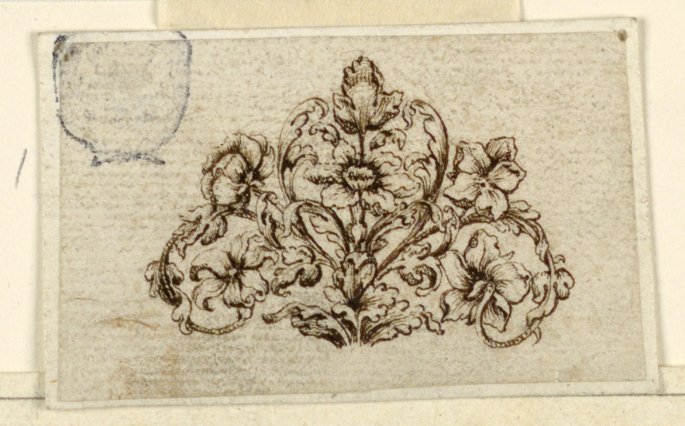 Drawing, Project for an Engraved Ornament; Italy; black chalk, pen and bistre on paper; H x W: 6.8 × 4.1 cm (2 11/16 × 1 5/8 in.); Museum purchase through gift of various donors; 1901-39-814