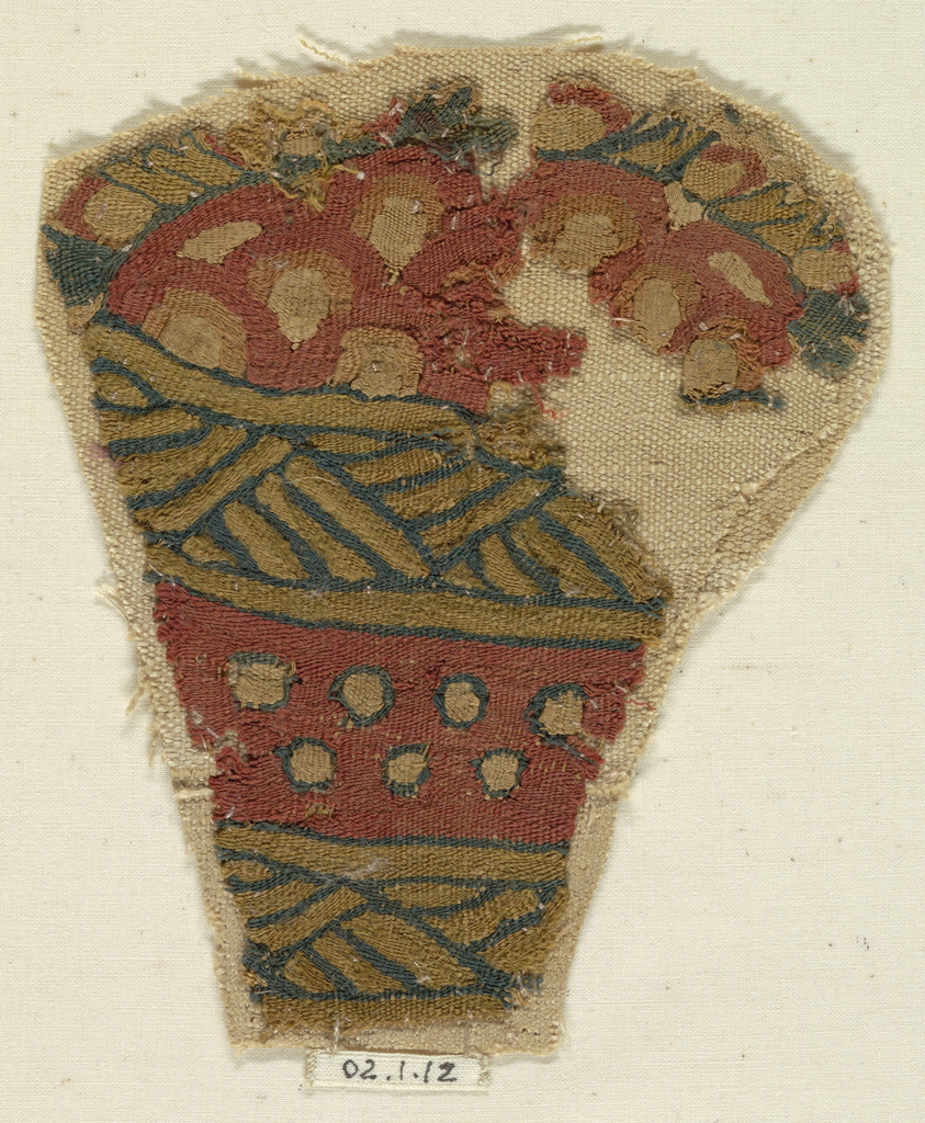 Fragment (Egypt); warp; s-spun linen. wefts; linen, wool; H x W: 13.5 × 11.5 cm (5 5/16 × 4 1/2 in.); Gift of John Pierpont Morgan; 1902-1-12