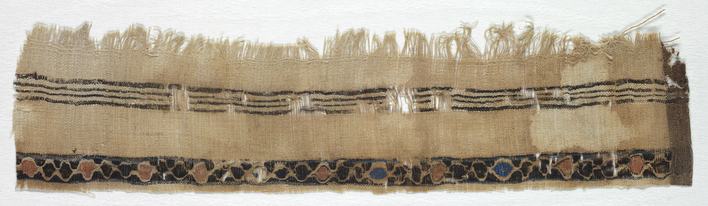 This is a Band. It is dated 8th–10th century and we acquired it in 1902. Its medium is linen. silk and its technique is plain weave and slit tapestry weave. It is a part of the Textiles department.