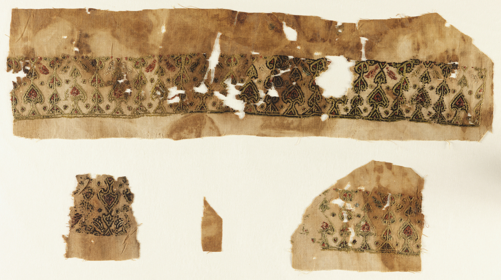 This is a Textile. It is dated 12th–14th century and we acquired it in 1902. Its medium is silk, linen and its technique is embroidery using silk threads on linen plain weave foundation. It is a part of the Textiles department.