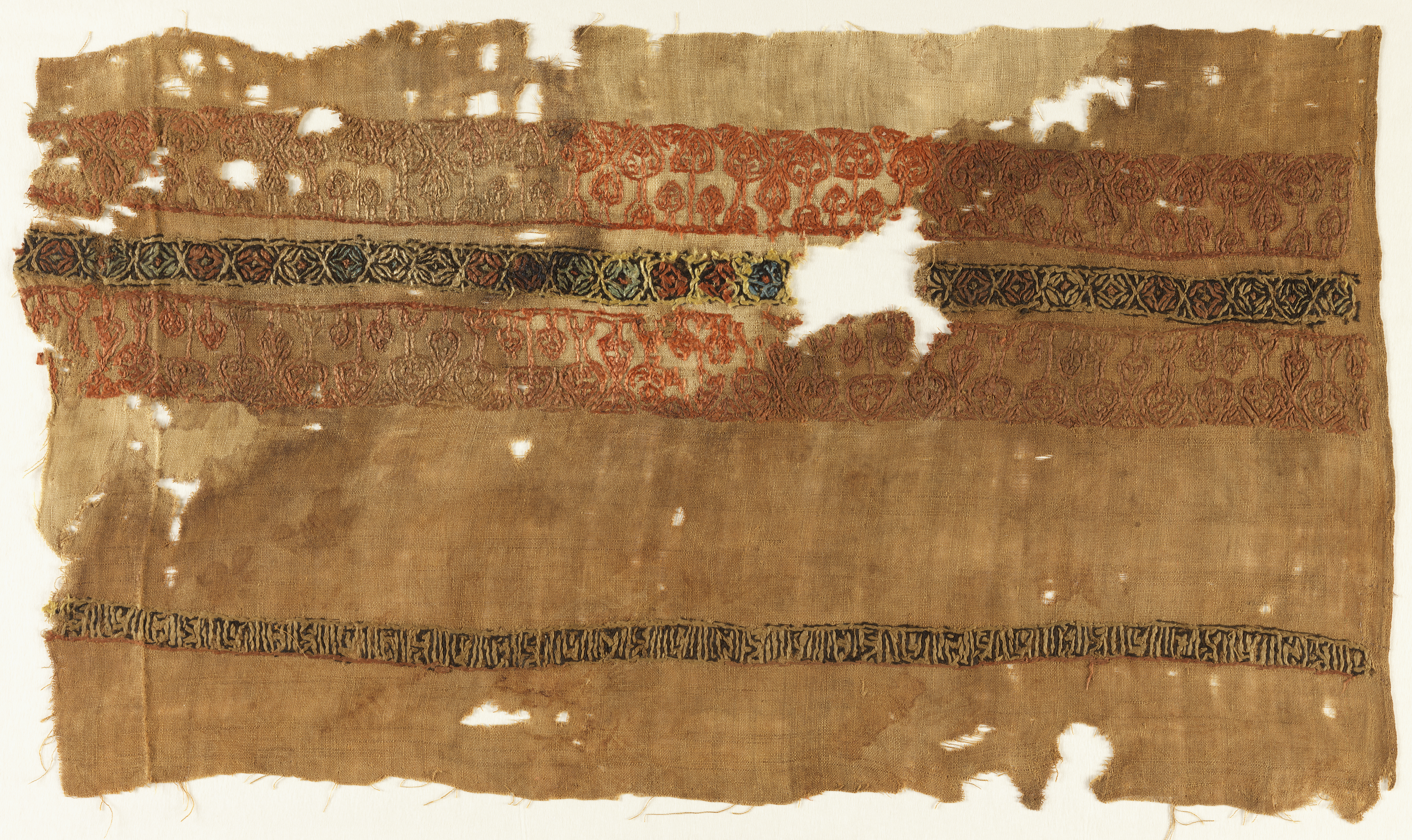 This is a Textile. It is dated 12th–14th century and we acquired it in 1902. Its medium is silk, linen and its technique is embroidery using silk threads on linen plain weave foundation. It is a part of the Textiles department.