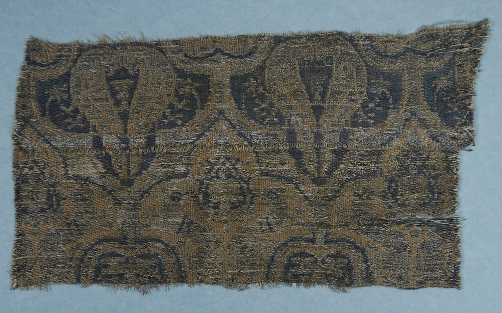 This is a Fragment. It is dated 13th century and we acquired it in 1902. Its medium is silk, metallic, linen and its technique is 2/1 twill with complementary wefts. It is a part of the Textiles department.
