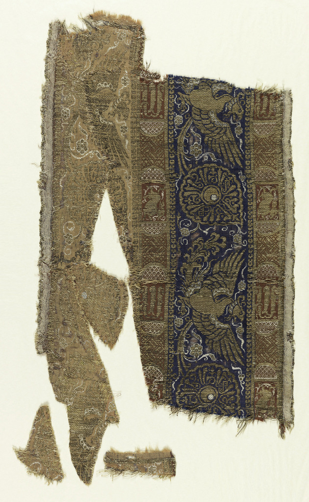 This is a Fragments. It is dated 14th century and we acquired it in 1902. Its medium is silk, metallic thread and its technique is 5&1 irregular satin patterned by plain weave. It is a part of the Textiles department.